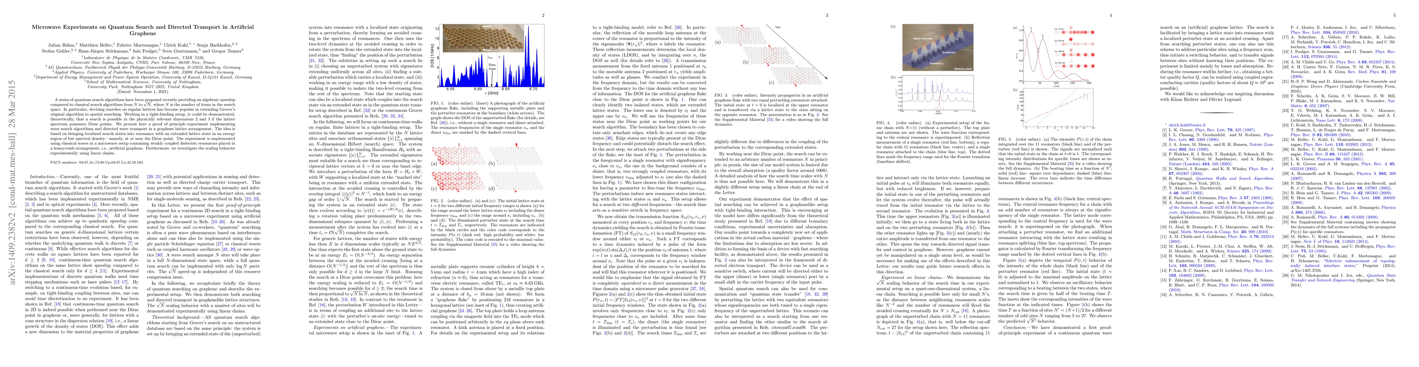 A series of quantum search algorithms have been proposed recently providing an algebraic speedup compared to classical search algorithms from $N$ to $\sqrt{N}$, where $N$ is the number of items in the search space. In particular, devising searches on regular lattices has become popular in extending Grover's original algorithm to spatial searching. Working in a tight-binding setup, it could be demonstrated, theoretically, that a search is possible in the physically relevant dimensions 2 and 3 if the lattice spectrum possesses Dirac points. We present here a proof of principle experiment implementing wave search algorithms and directed wave transport in a graphene lattice arrangement. The idea is based on bringing localized search states into resonance with an extended lattice state in an energy region of low spectral density---namely, at or near the Dirac point. The experiment is implemented using classical waves in a microwave setup containing weakly coupled dielectric resonators placed in a honeycomb arrangement, i.e., artificial graphene. Furthermore, we investigate the scaling behavior experimentally using linear chains.