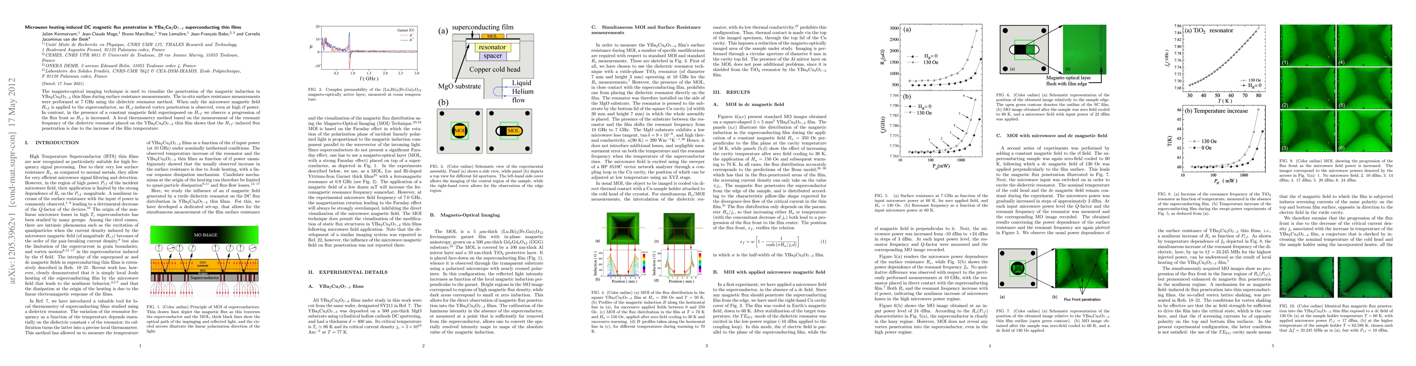 The magneto-optical imaging technique is used to visualize the penetration of the magnetic induction in YBa$_{2}$Cu$_{3}$O$_{7-\delta}$ thin films during surface resistance measurements. The in-situ surface resistance measurements were performed at 7 GHz using the dielectric resonator method. When only the microwave magnetic field $H_{rf}$ is applied to the superconductor, no $H_{rf}$-induced vortex penetration is observed, even at high rf power. In contrast, in the presence of a constant magnetic field superimposed on $H_{rf}$ we observe a progression of the flux front as $H_{rf}$ is increased. A local thermometry method based on the measurement of the resonant frequency of the dielectric resonator placed on the YBa$_{2}$Cu$_{3}$O$_{7-\delta}$ thin film shows that the $H_{rf}$--induced flux penetration is due to the increase of the film temperature.