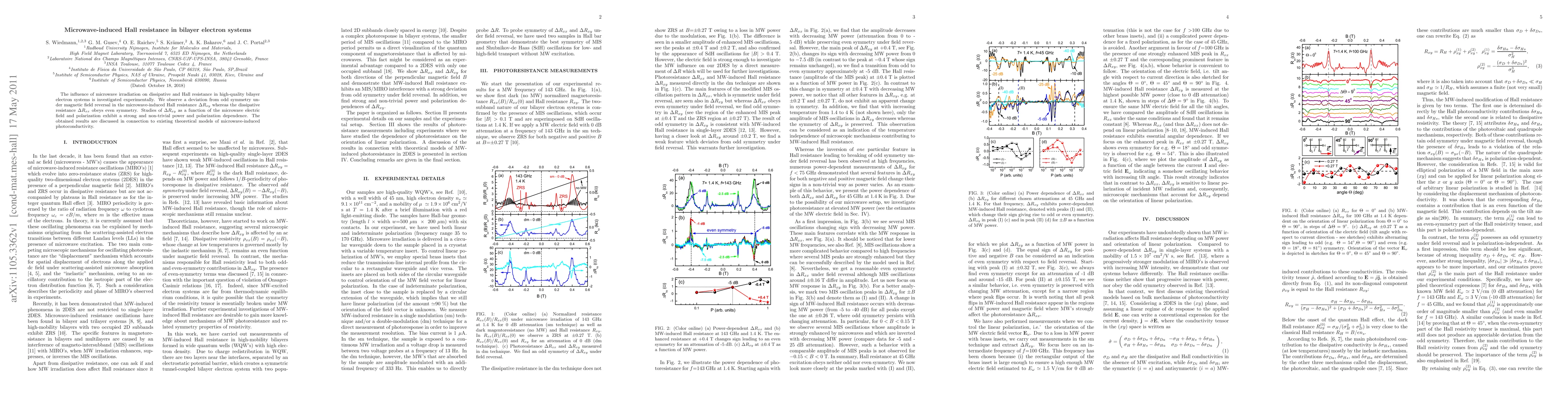This paper investigates microwave-induced Hall resistance in bilayer electron systems, finding that the induced Hall resistance $\Delta R_{xy}$ deviates from odd symmetry under magnetic reversal, while the dissipative resistance $\Delta R_{xx}$ follows even symmetry. The study reveals a complex power and polarization dependence of $\Delta R_{xy}$, which is discussed in relation to theoretical models of microwave-induced photoconductivity.