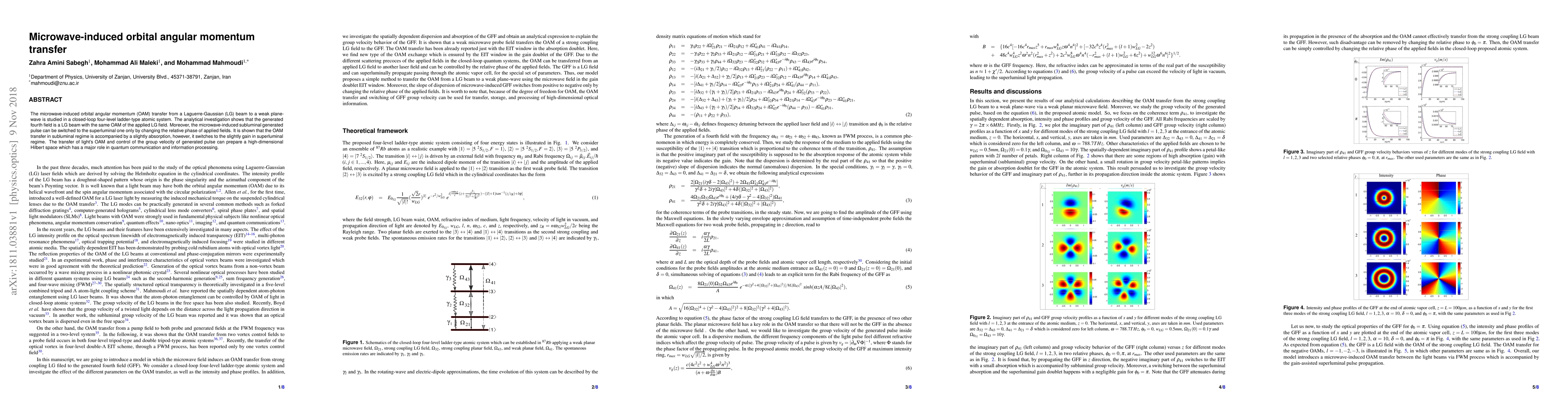 This paper investigates microwave-induced orbital angular momentum transfer from a Laguerre-Gaussian beam to a plane wave in a four-level atomic system, demonstrating that the generated field retains the original OAM. The study also reveals the ability to switch the generated pulse from subluminal to superluminal by adjusting the phase of applied fields, with OAM transfer showing slight absorption in subluminal and gain in superluminal regimes.