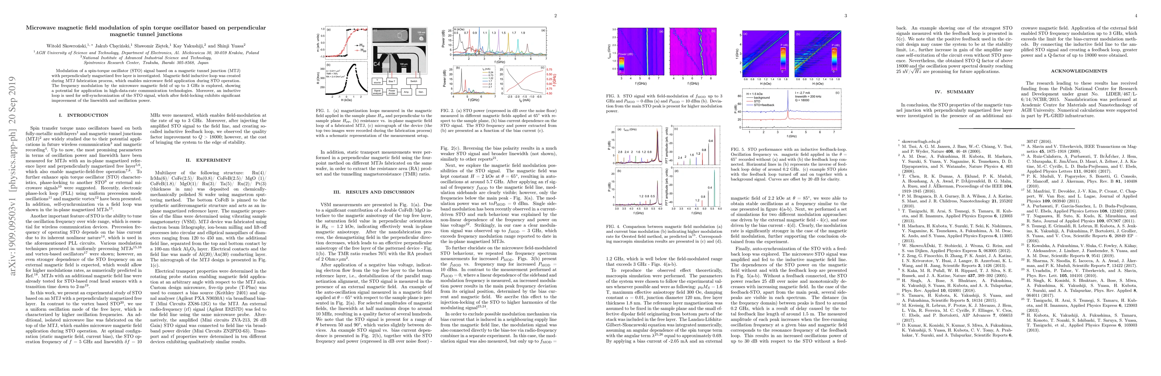 This paper investigates microwave magnetic field modulation of a spin-torque oscillator based on perpendicular magnetic tunnel junctions, demonstrating frequency modulation up to 3 GHz and potential for high-data-rate communication. The study also highlights self-synchronization via an inductive loop, improving linewidth and oscillation power.
