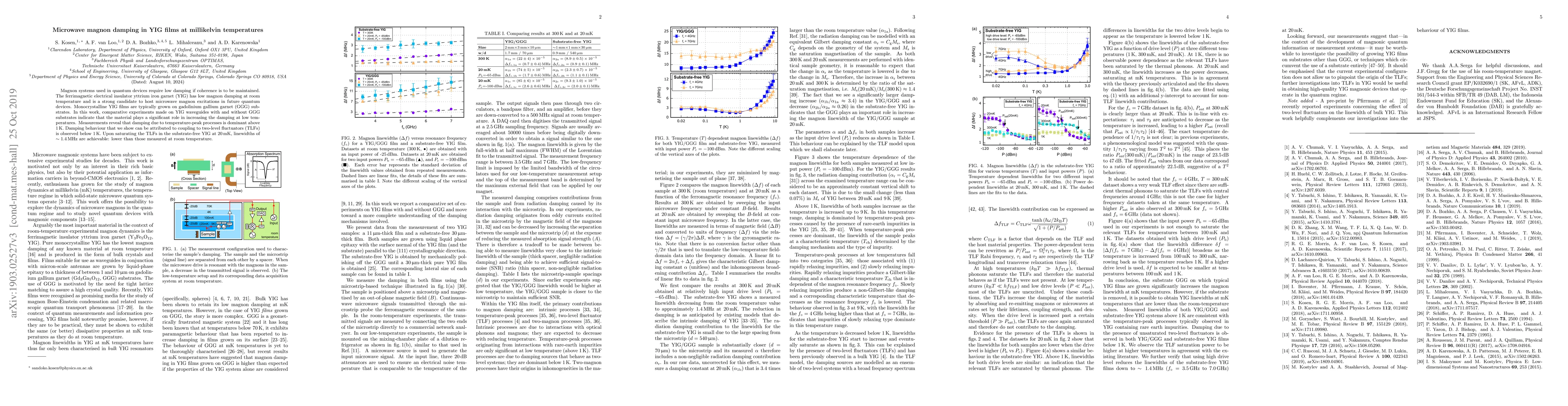 Magnon systems used in quantum devices require low damping if coherence is to be maintained. The ferrimagnetic electrical insulator yttrium iron garnet (YIG) has low magnon damping at room temperature and is a strong candidate to host microwave magnon excitations in future quantum devices. Monocrystalline YIG films are typically grown on gadolinium gallium garnet (GGG) substrates. In this work, comparative experiments made on YIG waveguides with and without GGG substrates indicate that the material plays a significant role in increasing the damping at low temperatures. Measurements reveal that damping due to temperature-peak processes is dominant above 1 K. Damping behaviour that we show can be attributed to coupling to two-level fluctuators (TLFs) is observed below 1 K. Upon saturating the TLFs in the substrate-free YIG at 20 mK, linewidths of 1.4 MHz are achievable: lower than those measured at room temperature.