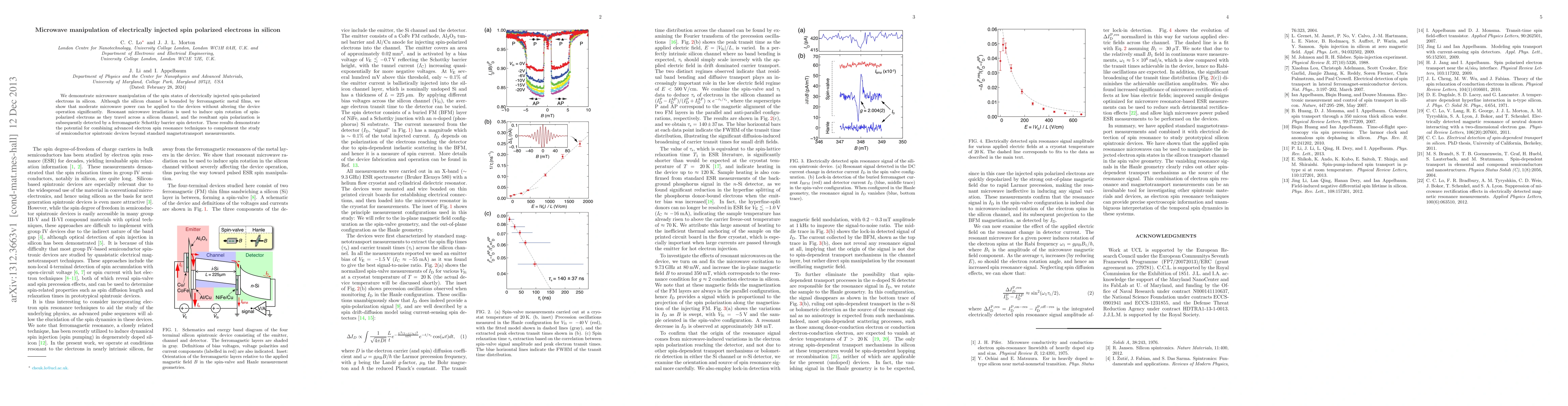 This paper demonstrates microwave manipulation of spin states in electrically injected, spin-polarized electrons in silicon, showing that resonant microwave irradiation can induce spin rotation without significantly affecting device operation. The findings suggest potential for advanced electron spin resonance techniques in studying semiconductor spintronic devices.