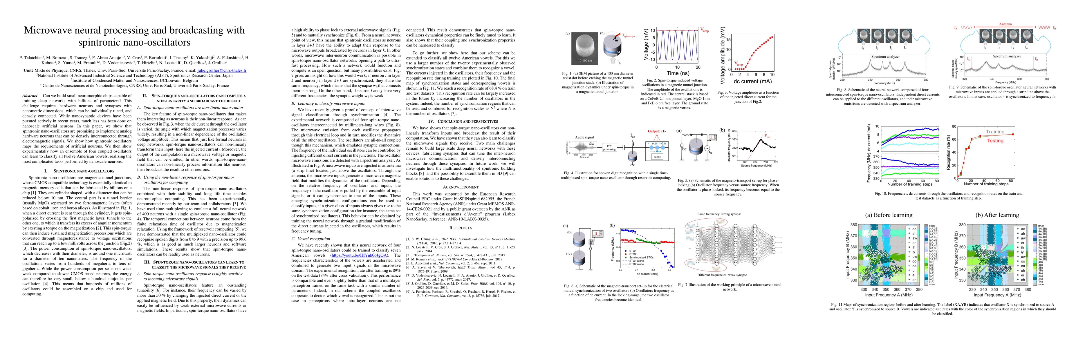 This paper explores the use of spintronic nano-oscillators to create dense, tunable nanoscale artificial neurons for neuromorphic chips. Experimentally, it demonstrates that an ensemble of four coupled spintronic oscillators can classify all twelve American vowels, showcasing their potential for complex neural processing tasks.