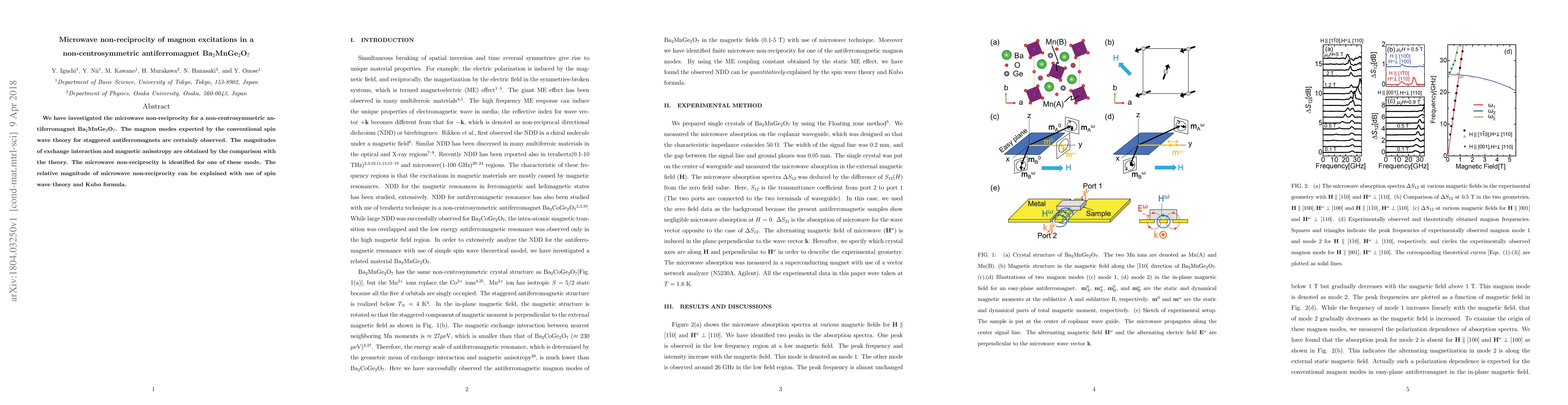 This study investigates microwave non-reciprocity in the non-centrosymmetric antiferromagnet Ba$_2$MnGe$_2$O$_7$, observing magnon modes consistent with spin wave theory. Microwave non-reciprocity is identified for one magnon mode, explained using spin wave theory and the Kubo formula.