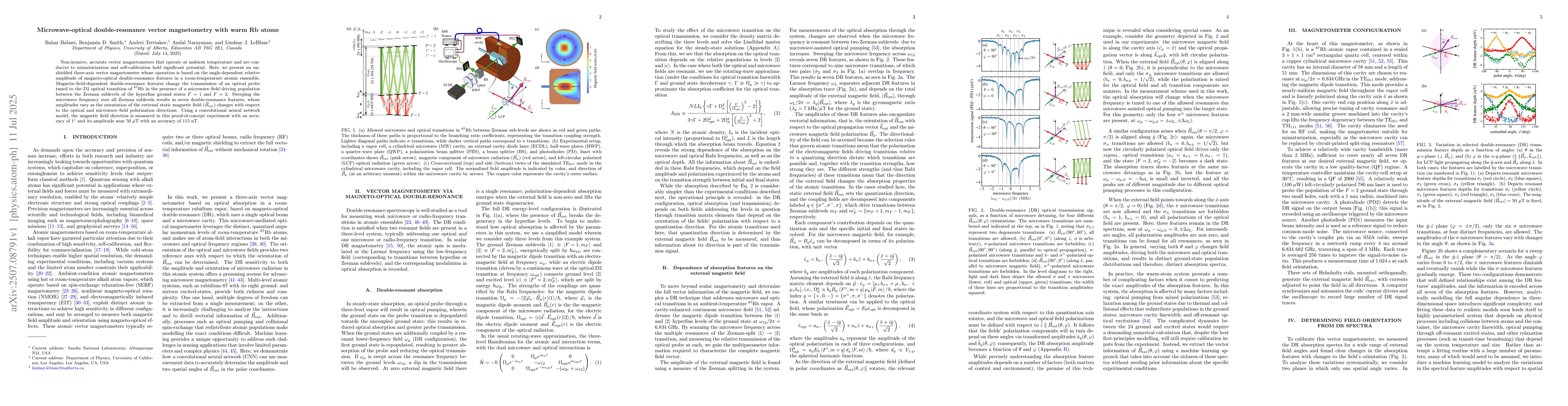 Developing a non-invasive, accurate vector magnetometer that operates at ambient temperature and is conducive to miniaturization and is self-calibrating is a significant challenge. Here, we present an unshielded three-axis vector magnetometer whose operation is based on the angle-dependent relative amplitude of magneto-optical double-resonance features in a room-temperature atomic ensemble. Magnetic-field-dependent double resonance features change the transmission of an optical probe tuned to the D2 optical transition of $^{87}$Rb in the presence of a microwave field driving population between the Zeeman sublevels of the ground state hyperfine levels $F = 1$ and $F = 2$. Sweeping the microwave frequency over all Zeeman sublevels results in seven double-resonance features, whose amplitudes vary as the orientation of the external static magnetic field changes with respect to the optical and microwave field polarization directions. Using a convolutional neural network model, the magnetic field direction is measured in this proof-of-concept experiment with an accuracy of 1{\deg} and its amplitude near 50 $\mu$T with an accuracy of 115 nT.