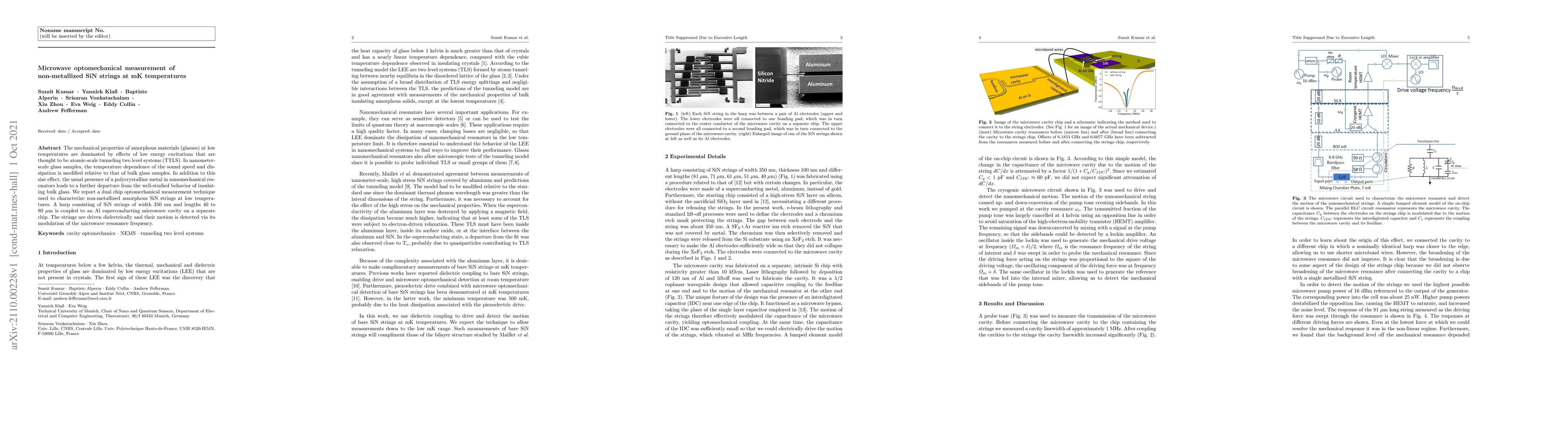 The research introduces a method using dual chips with a superconducting microwave cavity and non-metallized SiN strings to study mechanical properties of amorphous materials like silicon nitride at millikelvin temperatures. This technique eliminates the influence of metal layers, allowing for a better understanding of atomic-scale tunneling two-level systems in nanometer-scale glass samples.