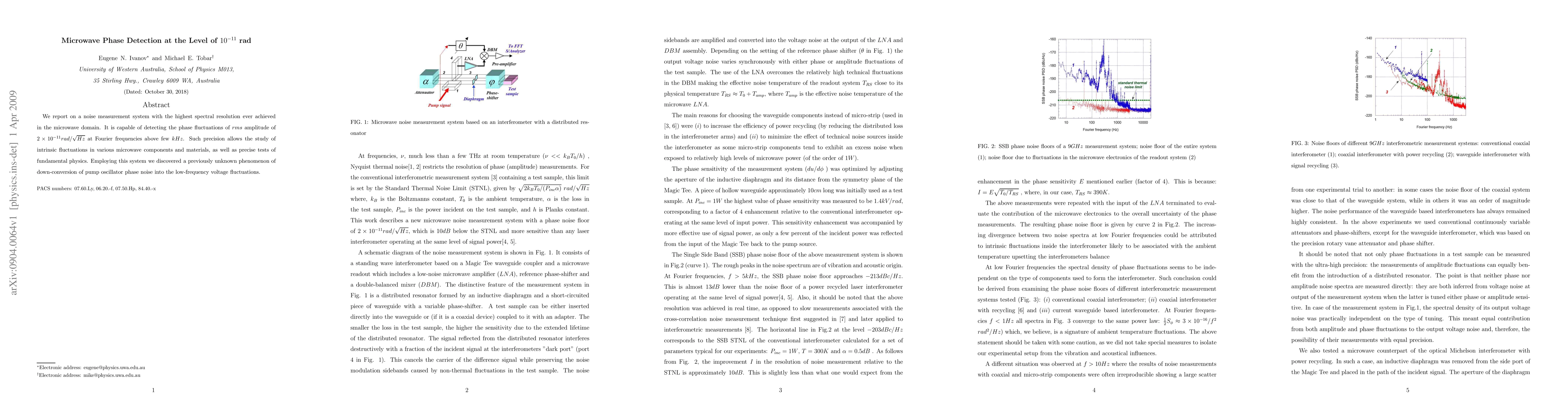We report on a noise measurement system with the highest spectral resolution ever achieved in the microwave domain. It is capable of detecting the phase fluctuations of $rms$ amplitude of $2\times10^{-11} rad/\sqrt{Hz}$ at Fourier frequencies above few $kHz$. Such precision allows the study of intrinsic fluctuations in various microwave components and materials, as well as precise tests of fundamental physics. Employing this system we discovered a previously unknown phenomenon of down-conversion of pump oscillator phase noise into the low-frequency voltage fluctuations.