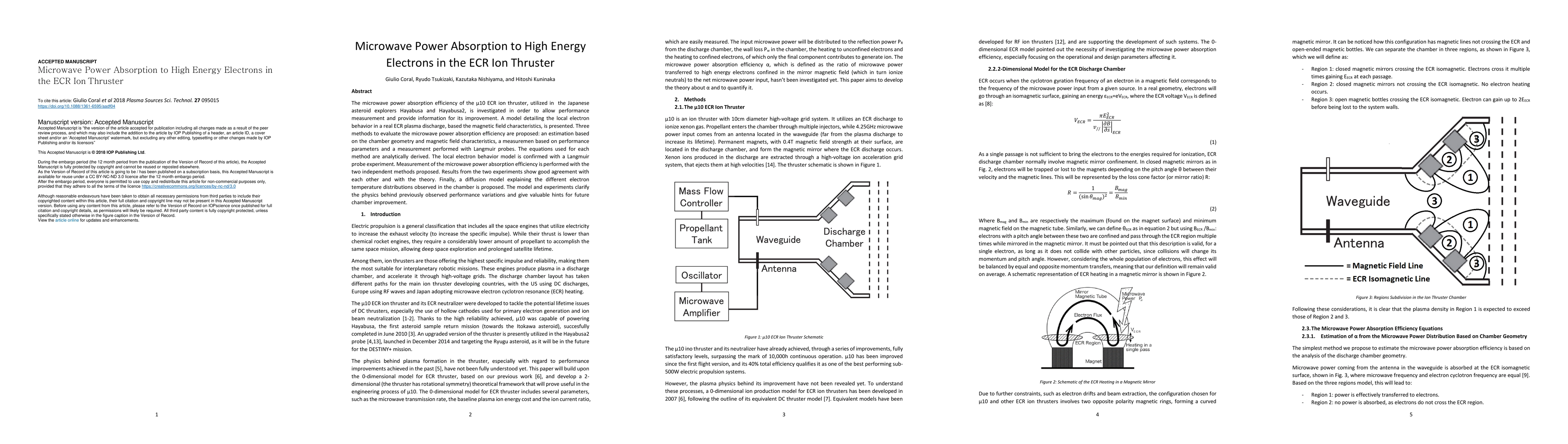 This paper investigates the microwave power absorption efficiency in the mu10 ECR ion thruster used in Japanese asteroid missions, proposing three evaluation methods and confirming a local electron behavior model with Langmuir probes. Results from independent methods show good agreement, providing insights for future chamber improvements.