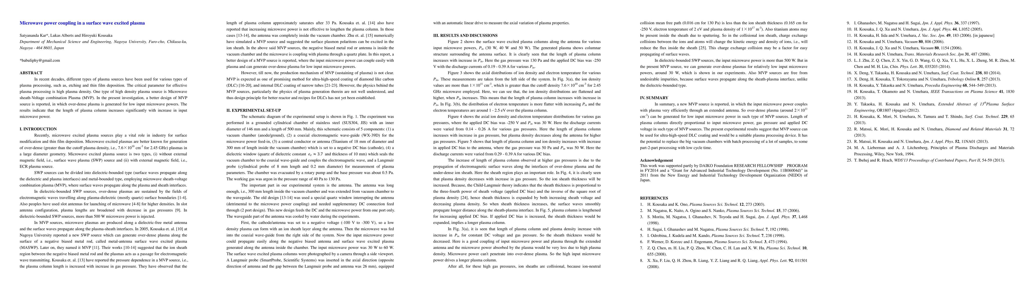 This paper investigates an improved Microwave sheath-Voltage combination Plasma (MVP) source that generates high-density over-dense plasma with low input microwave power, showing a significant increase in plasma column length with higher microwave power.