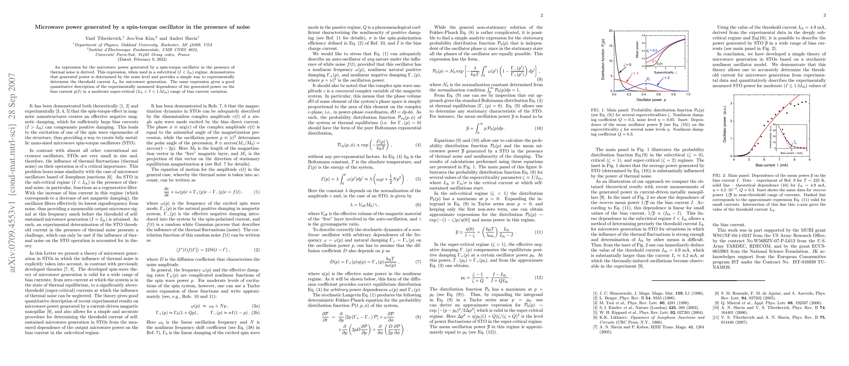 Summary: This paper derives an expression for microwave power generated by a spin-torque oscillator under thermal noise, showing its dependence on noise level and providing a method to determine the threshold current for microwave generation, with good quantitative agreement in moderate super-critical current ranges.