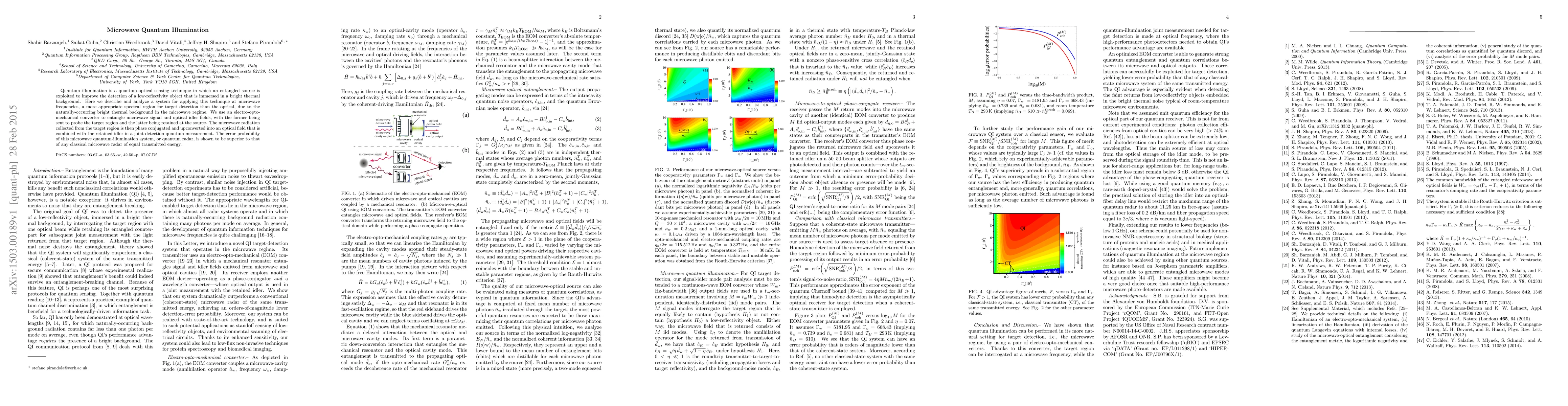 This paper explores microwave quantum illumination, a technique using entangled microwave and optical fields to enhance the detection of low-reflectivity objects against a bright thermal background. The study demonstrates superior error probability for this quantum radar compared to classical microwave radars.