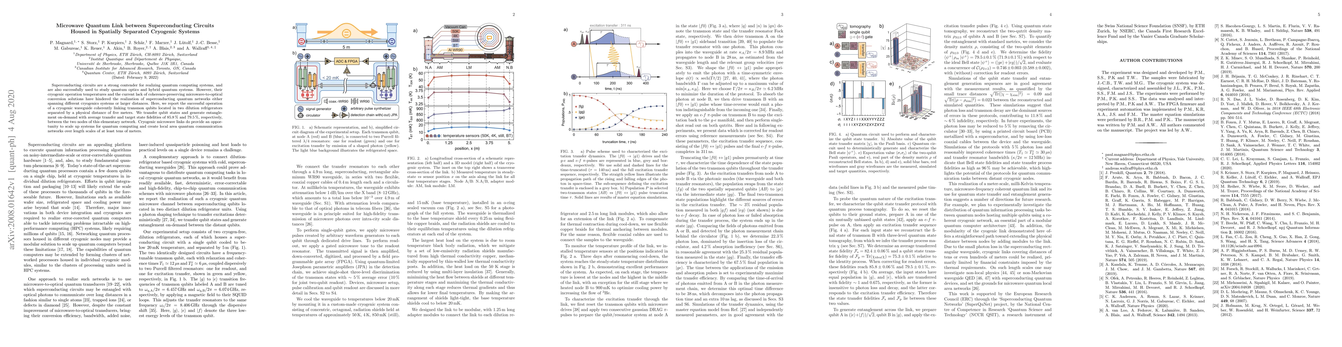This paper reports the successful creation of a cryogenic microwave link connecting superconducting qubits in two spatially separated dilution refrigerators, achieving state transfer and entanglement generation with high fidelity. This breakthrough paves the way for scalable quantum computing and local area quantum communication networks over tens of meters.