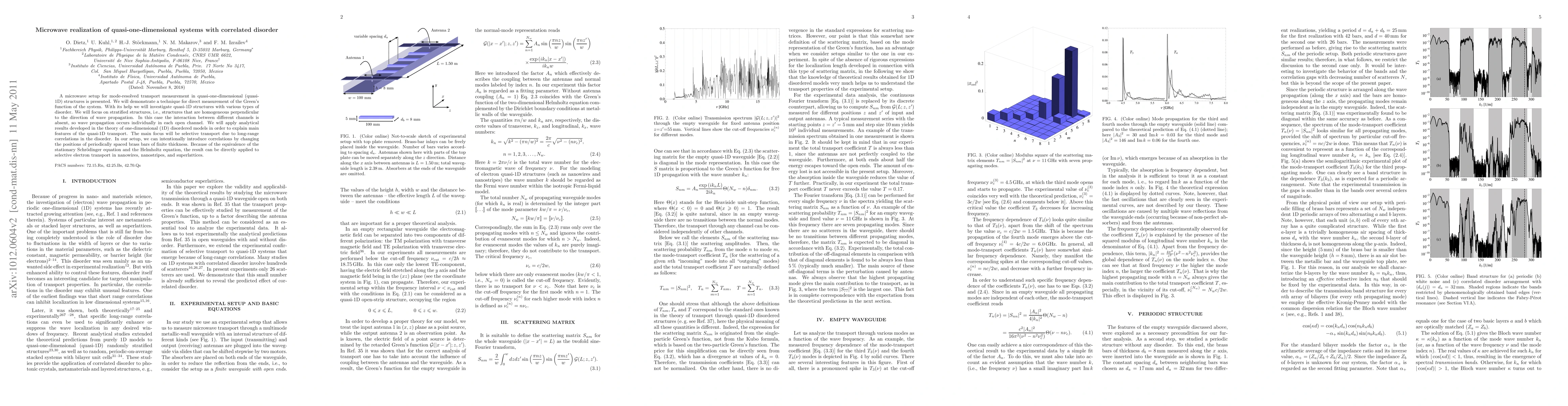 A microwave setup for mode-resolved transport measurement in quasi-one-dimensional (quasi-1D) structures is presented. We will demonstrate a technique for direct measurement of the Green's function of the system. With its help we will investigate quasi-1D structures with various types of disorder. We will focus on stratified structures, i.e., structures that are homogeneous perpendicular to the direction of wave propagation. In this case the interaction between different channels is absent, so wave propagation occurs individually in each open channel. We will apply analytical results developed in the theory of one-dimensional (1D) disordered models in order to explain main features of the quasi-1D transport. The main focus will be selective transport due to long-range correlations in the disorder. In our setup, we can intentionally introduce correlations by changing the positions of periodically spaced brass bars of finite thickness. Because of the equivalence of the stationary Schr\"odinger equation and the Helmholtz equation, the result can be directly applied to selective electron transport in nanowires, nanostripes, and superlattices.