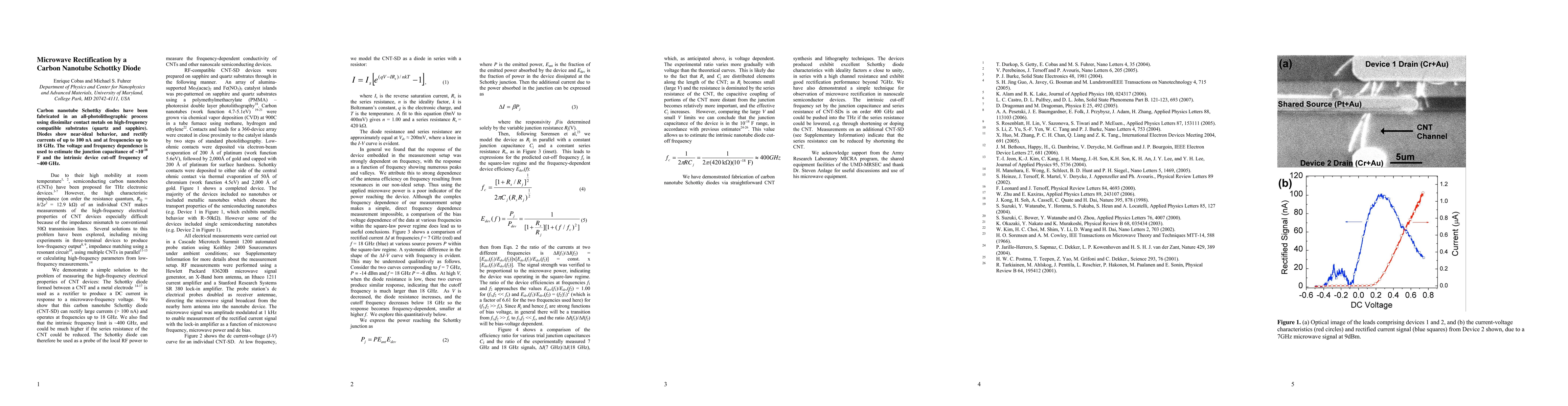Carbon nanotube Schottky diodes, fabricated using a photolithographic process on quartz and sapphire, exhibit near-ideal rectification with currents up to 100 nA and frequencies up to 18 GHz. The study estimates a junction capacitance of ~10-18 F and an intrinsic device cut-off frequency of ~400 GHz.