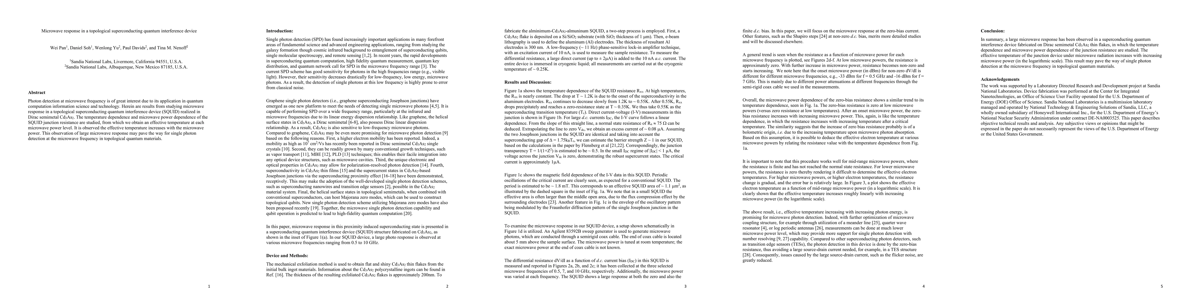 This study investigates the microwave response in a topological superconducting quantum interference device (SQUID) made from Cd3As2, revealing an increase in effective temperature with microwave power. These findings could advance single photon detection at microwave frequencies using topological quantum materials.