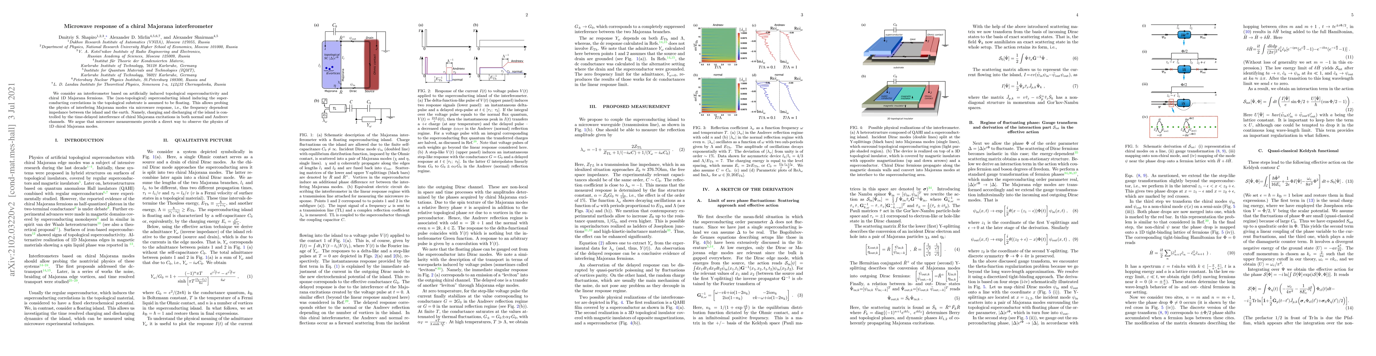 We consider an interferometer based on artificially induced topological superconductivity and chiral 1D Majorana fermions. The (non-topological) superconducting island inducing the superconducting correlations in the topological substrate is assumed to be floating. This allows probing the physics of interfering Majorana modes via microwave response, i.e., the frequency dependent impedance between the island and the earth. Namely, charging and discharging of the island is controlled by the time-delayed interference of chiral Majorana excitations in both normal and Andreev channels. We argue that microwave measurements provide a direct way to observe the physics of 1D chiral Majorana modes.