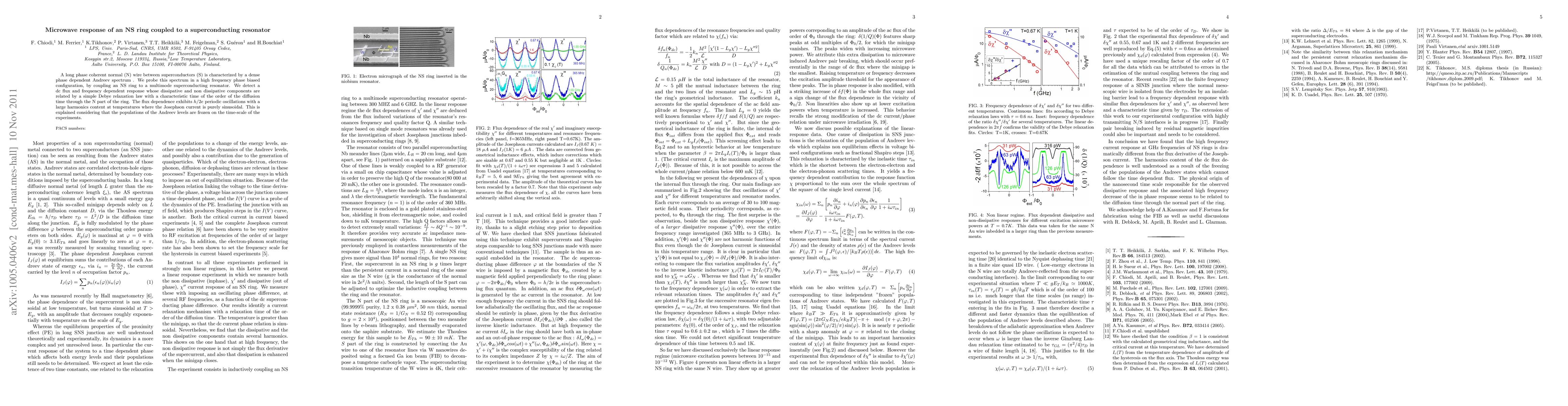 A long phase coherent normal (N) wire between superconductors (S) is characterized by a dense phase dependent Andreev spectrum . We probe this spectrum in a high frequency phase biased configuration, by coupling an NS ring to a multimode superconducting resonator. We detect a dc flux and frequency dependent response whose dissipative and non dissipative components are related by a simple Debye relaxation law with a characteristic time of the order of the diffusion time through the N part of the ring. The flux dependence exhibits $h/2e$ periodic oscillations with a large harmonics content at temperatures where the Josephson current is purely sinusoidal. This is explained considering that the populations of the Andreev levels are frozen on the time-scale of the experiments.