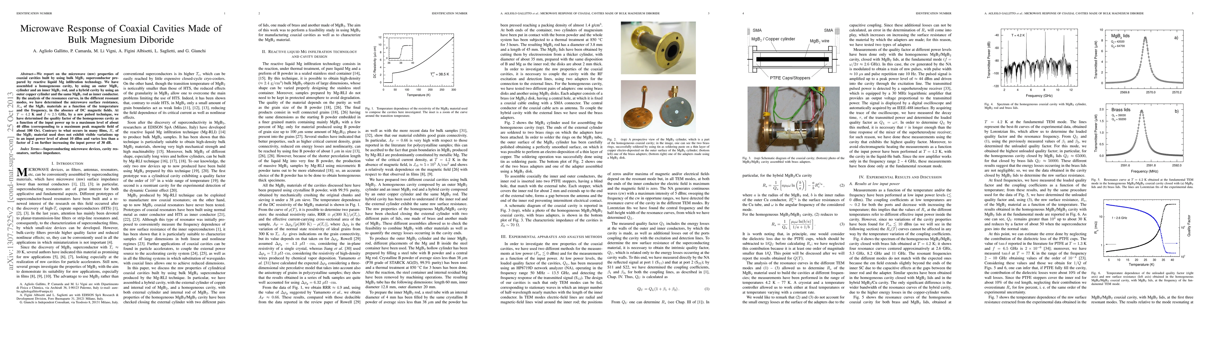 We report on the microwave (mw) properties of coaxial cavities built by using bulk MgB2 superconductor prepared by reactive liquid Mg infiltration technology. We have assembled a homogeneous cavity, by using an outer MgB2 cylinder and an inner MgB2 rod, and a hybrid cavity by using an outer copper cylinder and the same MgB2 rod as inner conductor. By the analysis of the resonance curves, in the different resonant modes, we have determined the microwave surface resistance, Rs, of the MgB2 materials as a function of the temperature and the frequency, in the absence of DC magnetic fields. At T = 4.2 K and f = 2.5 GHz, by a mw pulsed technique, we have determined the quality factor of the homogeneous cavity as a function of the input power up to a maximum level of about 40 dBm (corresponding to a maximum peak magnetic field of about 100 Oe). Contrary to what occurs in many films, Rs of the MgB2 material used does not exhibit visible variations up to an input power level of about 10 dBm and varies less than a factor of 2 on further increasing the input power of 30 dB.