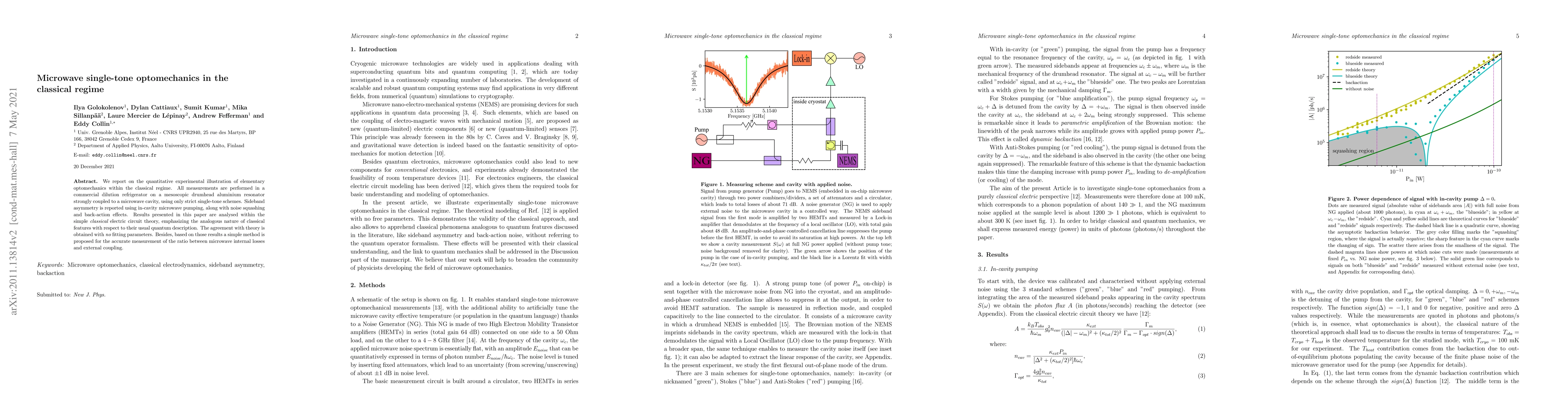 This paper demonstrates classical optomechanics in a mesoscopic aluminum resonator using single-tone microwave schemes, showing sideband asymmetry, noise squashing, and back-action effects. The findings align with classical electric circuit theory without any fitting parameters, and propose a method for measuring microwave internal losses versus external coupling.