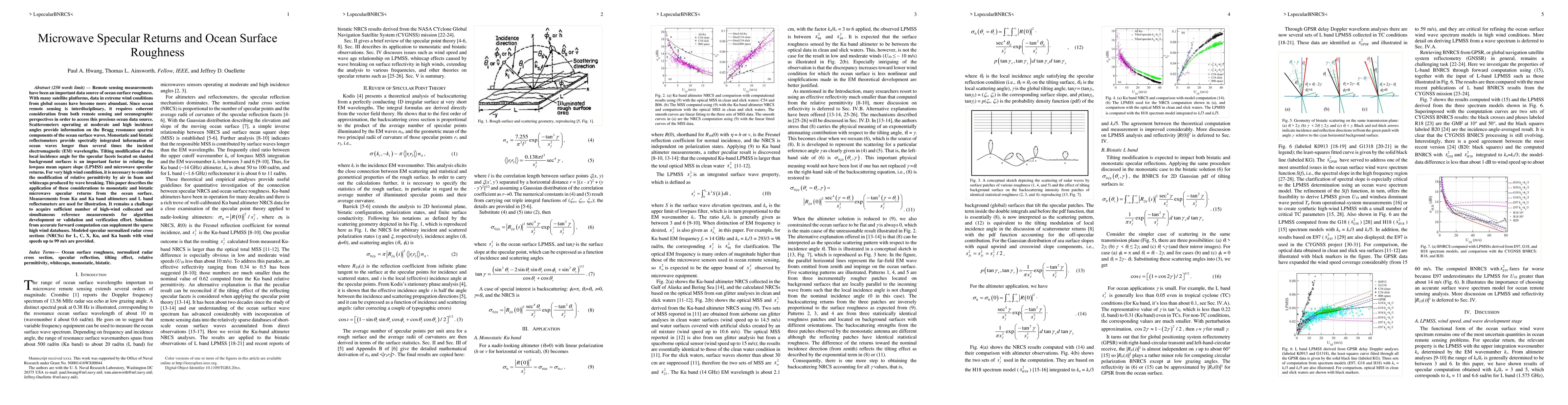 This paper explores the relationship between microwave specular returns and ocean surface roughness, using measurements from scatterometers and reflectometers. It highlights the importance of incidence angle modifications and the effects of foam and whitecaps in high wind conditions, providing modeled radar cross sections for various microwave bands.