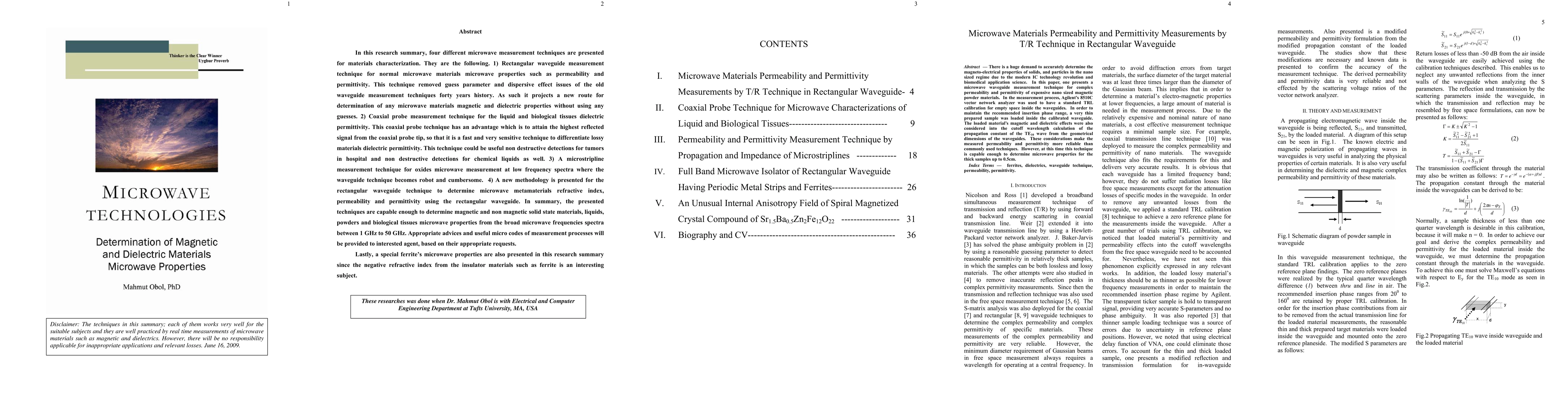 In this study, four different techniques are presented. 1 Rectangular waveguide measurement technique for normal microwave materials microwave properties such as permeability and permittivity. This technique removed guess parameter and dispersive effect issues of the old waveguide measurement techniques. It projects a new route for determination of any microwave materials magnetic and dielectric properties without using any guesses. 2 Coaxial probe measurement technique for the liquid and biological tissues dielectric permittivity. This coaxial probe technique has an advantage which is to attain the highest reflected signal from the coaxial probe tip, so that it is a fast and very sensitive technique to differentiate lossy materials dielectric permittivity. This technique could be useful non destructive detections for tumors in hospital and non destructive detections for chemical liquids as well. 3 A microstripline measurement technique for oxides microwave measurement at low frequency spectra where the waveguide technique becomes robot and cumbersome. 4 A new methodology is presented for the rectangular waveguide technique to determine microwave metamaterials refractive index, permeability and permittivity using the rectangular waveguide. In summary, the presented techniques are capable enough to determine magnetic and non magnetic solid state materials, liquids, powders and biological tissues microwave properties from the broad microwave frequencies spectra between 1 GHz to 50 GHz. Lastly, a special ferrites microwave properties are also presented since the negative refractive index from the insulator ferrite could be an interesting subject.