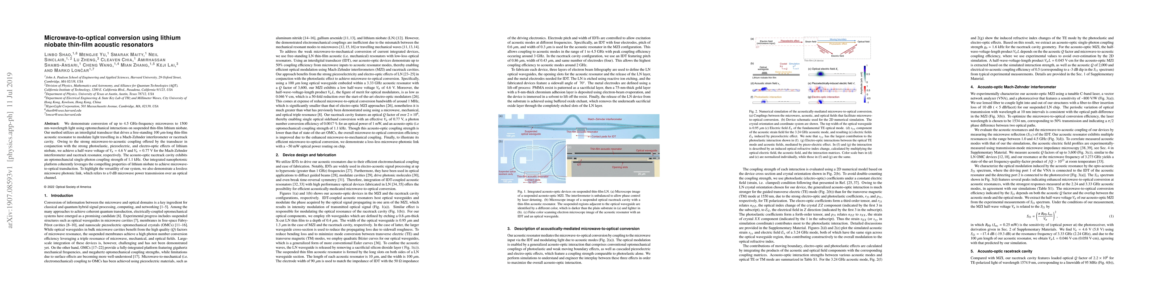 This research demonstrates a method for converting 4.5 GHz microwaves to 1500 nm light using optomechanical interactions in suspended thin-film lithium niobate resonators. It achieves a low half-wave voltage and showcases a versatile, lossless microwave photonic link.