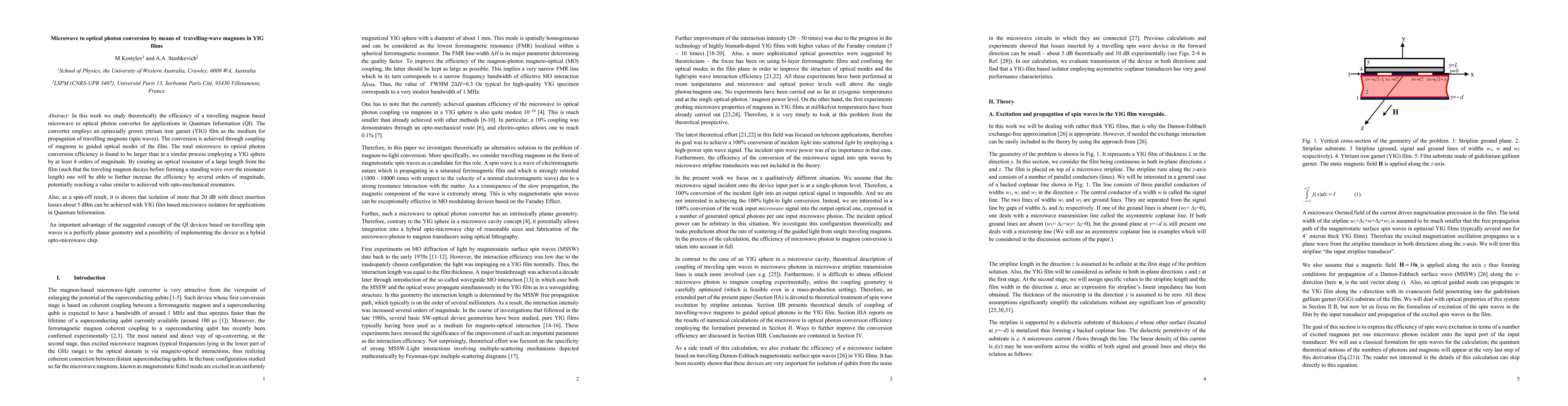 Researchers developed a microwave to optical photon converter using travelling magnons in YIG films, achieving efficiency 4 orders of magnitude higher than similar processes, with potential for further increases.