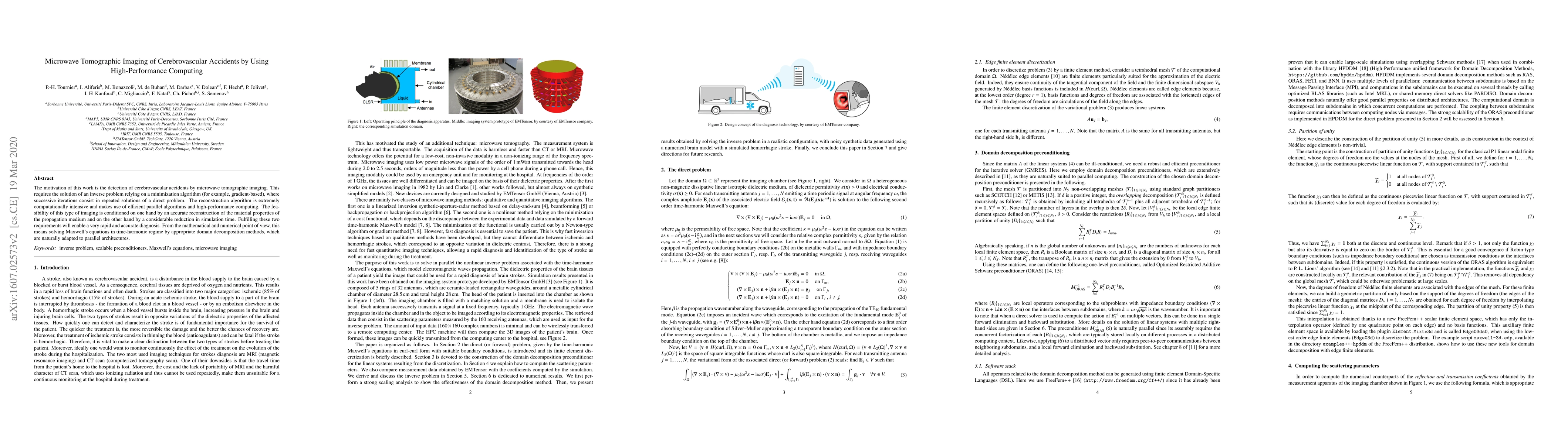 The motivation of this work is the detection of cerebrovascular accidents by microwave tomographic imaging. This requires the solution of an inverse problem relying on a minimization algorithm (for example, gradient-based), where successive iterations consist in repeated solutions of a direct problem. The reconstruction algorithm is extremely computationally intensive and makes use of efficient parallel algorithms and high-performance computing. The feasibility of this type of imaging is conditioned on one hand by an accurate reconstruction of the material properties of the propagation medium and on the other hand by a considerable reduction in simulation time. Fulfilling these two requirements will enable a very rapid and accurate diagnosis. From the mathematical and numerical point of view, this means solving Maxwell's equations in time-harmonic regime by appropriate domain decomposition methods, which are naturally adapted to parallel architectures.