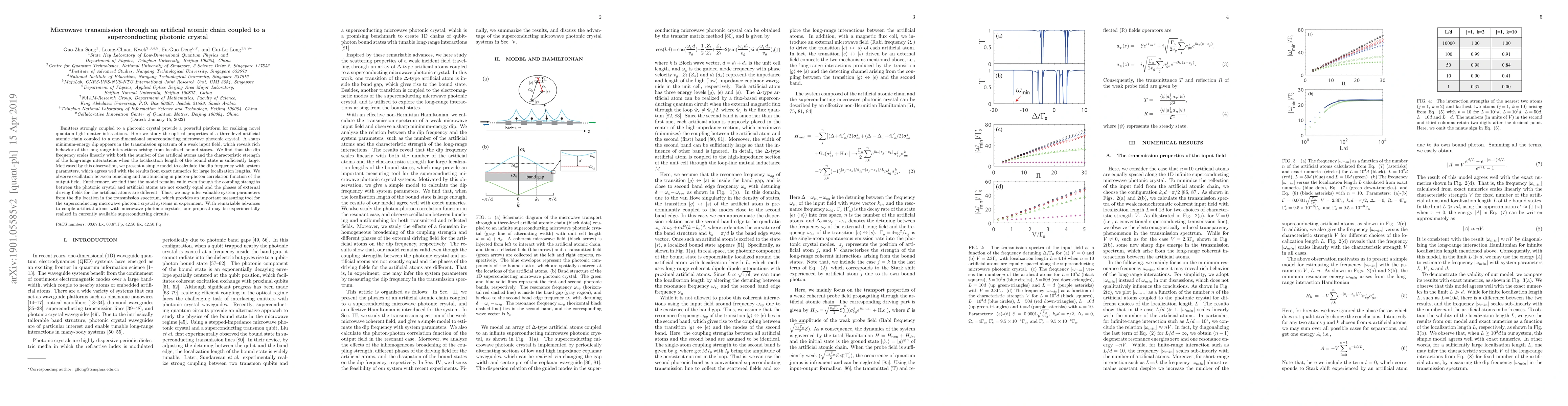 This research investigates the optical properties of a three-level artificial atomic chain coupled to a superconducting microwave photonic crystal, revealing a sharp minimum-energy dip in transmission spectra indicative of long-range interactions. The study proposes a model to predict the dip frequency based on system parameters, which agrees with numerics and suggests a practical tool for measuring system properties in superconducting circuits.