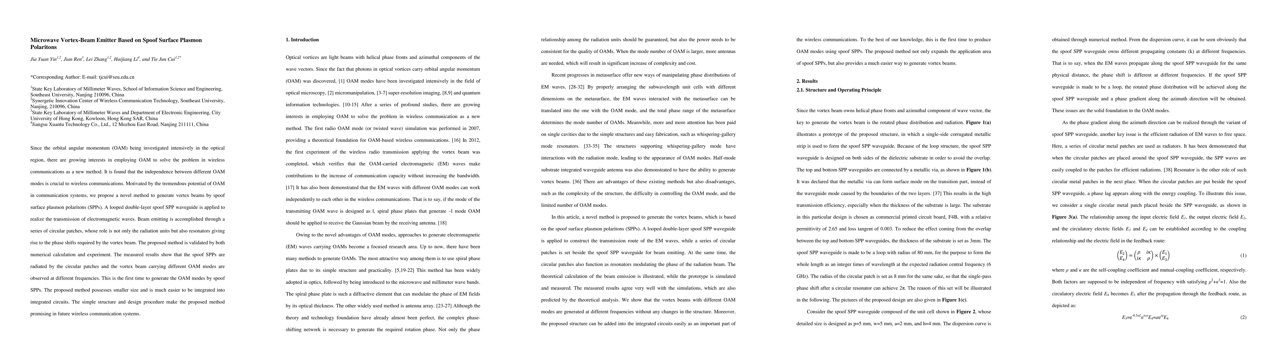 This paper proposes a microwave vortex-beam emitter utilizing spoof surface plasmon polaritons (SPPs) to generate orbital angular momentum (OAM) modes for wireless communications. The method employs a looped double-layer spoof SPP waveguide with circular patches to achieve the required phase shifts, validated through both numerical and experimental results, showcasing smaller size and potential for integration into circuits.