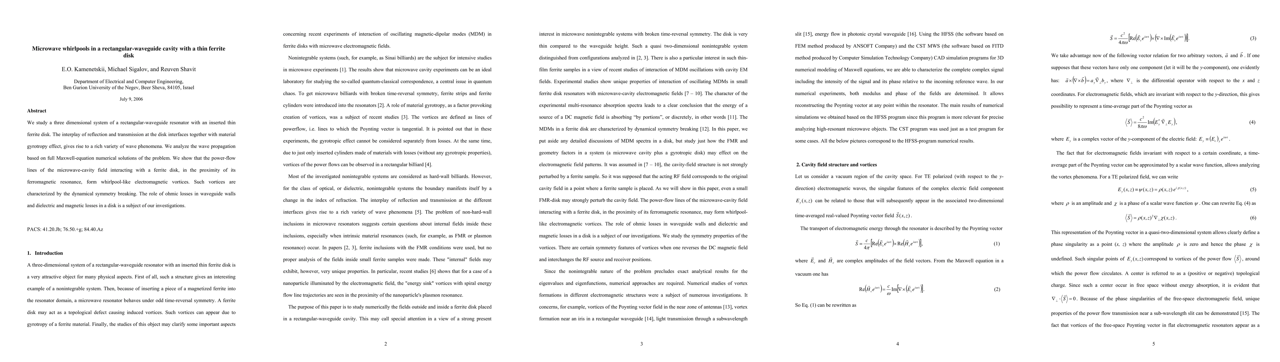 Researchers study microwave whirlpools in a rectangular-waveguide cavity with a thin ferrite disk, finding whirlpool-like electromagnetic vortices that break dynamical symmetry near the ferromagnetic resonance of the disk.