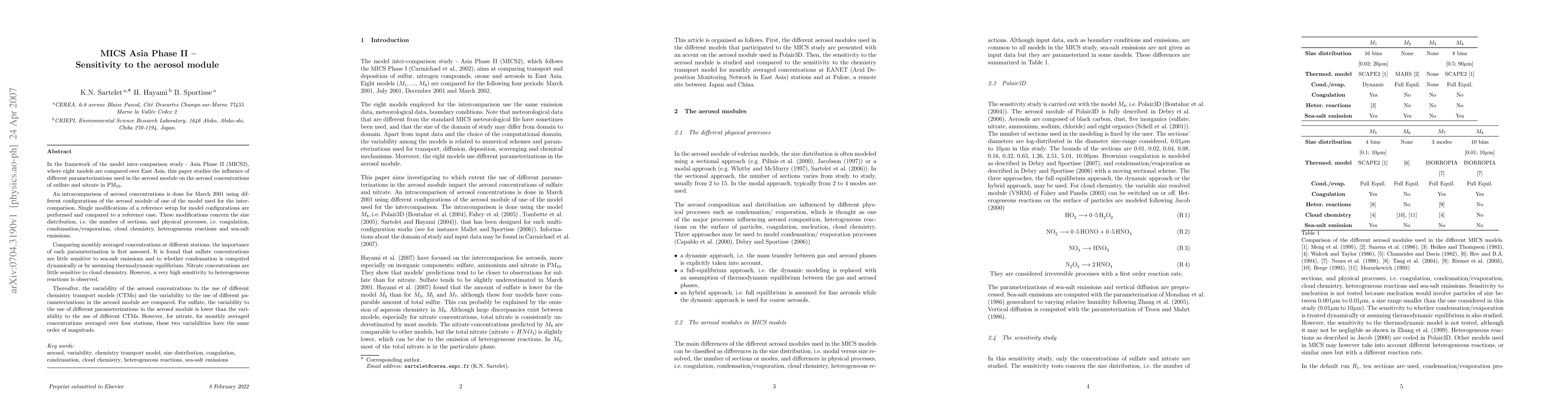 This paper examines the influence of various aerosol module parameterizations on sulfate and nitrate concentrations in PM10 within the MICS Asia Phase II framework. It finds that sulfate is less sensitive to certain parameters, while nitrate shows high sensitivity to heterogeneous reactions, and that variability due to different parameterizations is comparable to that from different chemistry transport models for nitrate.