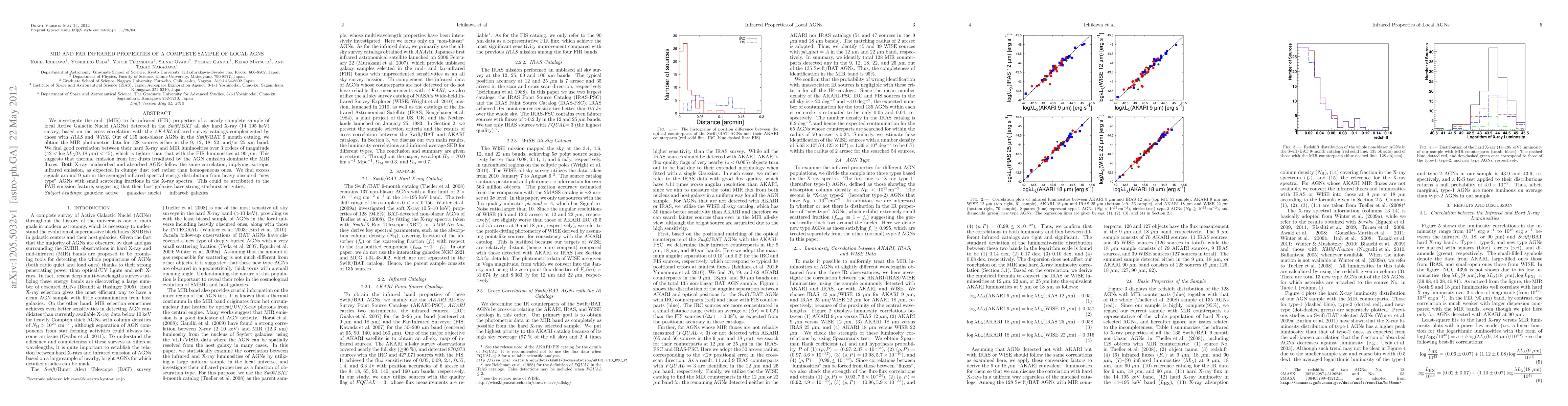 We investigate the mid- (MIR) to far-infrared (FIR) properties of a nearly complete sample of local Active Galactic Nuclei (AGNs) detected in the Swift/BAT all sky hard X-ray (14-195 keV) survey, based on the cross correlation with the AKARI infrared survey catalogs complemented by those with IRAS and WISE. Out of 135 non-blazer AGNs in the Swift/BAT 9 month catalog, we obtain the MIR photometric data for 128 sources either in the 9, 12, 18, 22, and/or 25 um band. We find good correlation between their hard X-ray and MIR luminosities over 3 orders of magnitude (42< log lambda L_{lambda}(9, 18 um)< 45), which is tighter than that with the FIR luminosities at 90 um. This suggests that thermal emission from hot dusts irradiated by the AGN emission dominate the MIR fluxes. Both X-ray unabsorbed and absorbed AGNs follow the same correlation, implying isotropic infrared emission, as expected in clumpy dust tori rather than homogeneous ones. We find excess signals around 9 um in the averaged infrared spectral energy distribution from heavy obscured "new type" AGNs with small scattering fractions in the X-ray spectra. This could be attributed to the PAH emission feature, suggesting that their host galaxies have strong starburst activities.