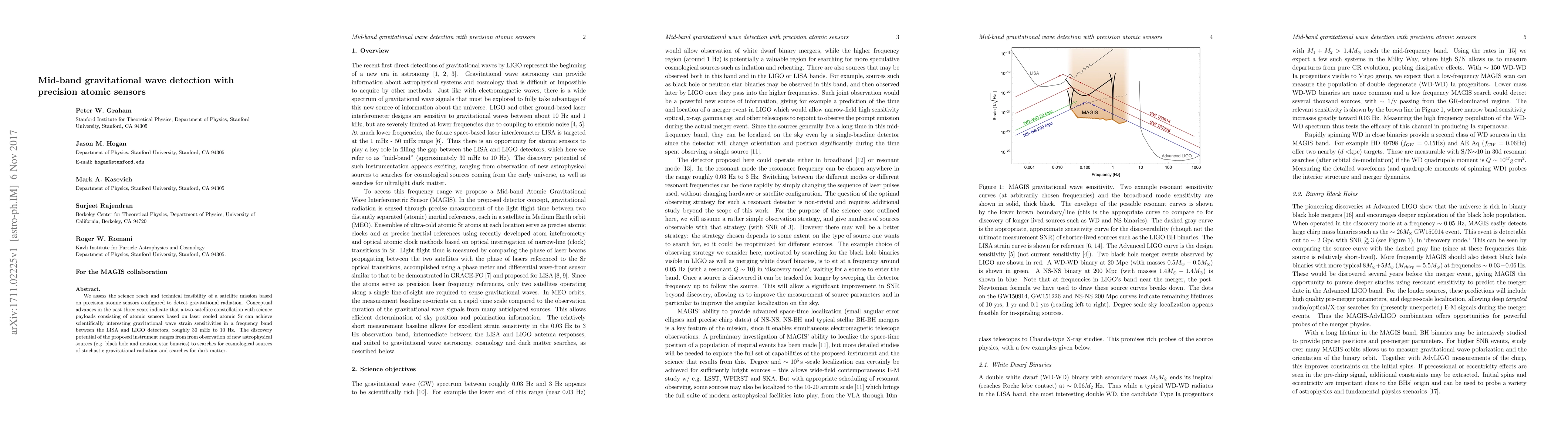 We assess the science reach and technical feasibility of a satellite mission based on precision atomic sensors configured to detect gravitational radiation. Conceptual advances in the past three years indicate that a two-satellite constellation with science payloads consisting of atomic sensors based on laser cooled atomic Sr can achieve scientifically interesting gravitational wave strain sensitivities in a frequency band between the LISA and LIGO detectors, roughly 30 mHz to 10 Hz. The discovery potential of the proposed instrument ranges from from observation of new astrophysical sources (e.g. black hole and neutron star binaries) to searches for cosmological sources of stochastic gravitational radiation and searches for dark matter.