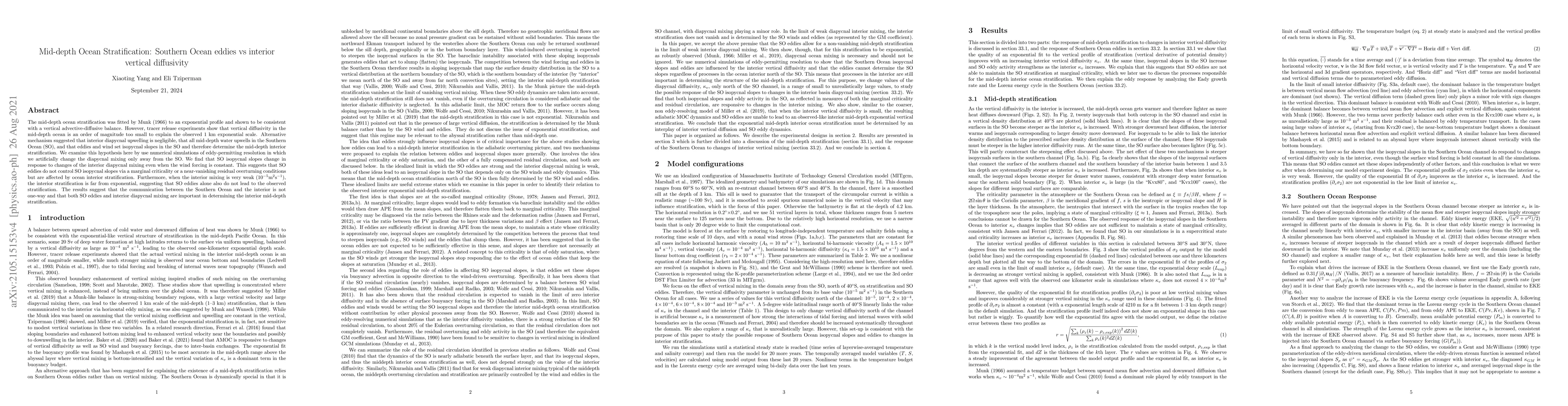 This paper investigates the role of Southern Ocean (SO) eddies versus interior diapycnal mixing in shaping mid-depth ocean stratification. It finds that while SO eddies influence isopycnal slopes, both SO processes and interior diapycnal mixing are necessary to achieve the observed exponential stratification.