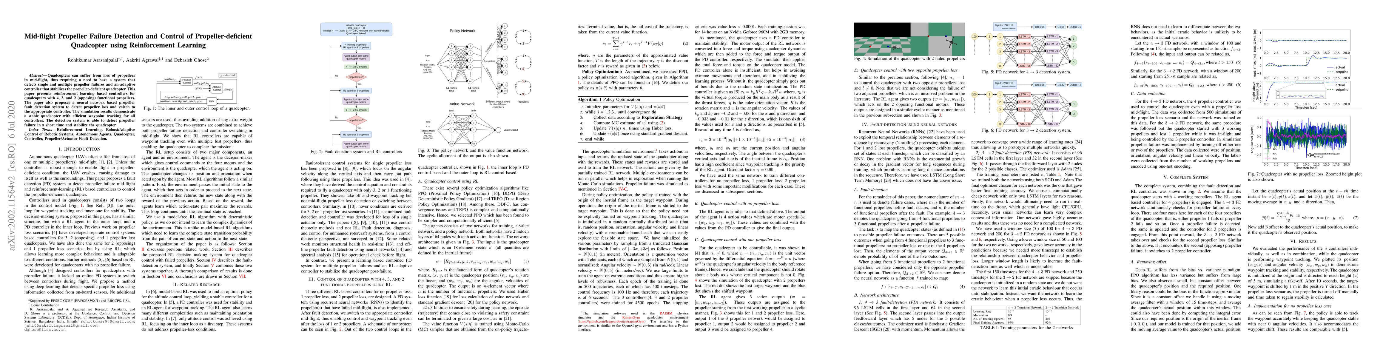 This paper develops reinforcement learning controllers for quadcopters with varying functional propellers (4, 3, and 2) to maintain stability after propeller failure. It also introduces a neural network-based detection system for quick identification of propeller loss and appropriate controller switching, achieving stable flight and efficient waypoint tracking in simulations.