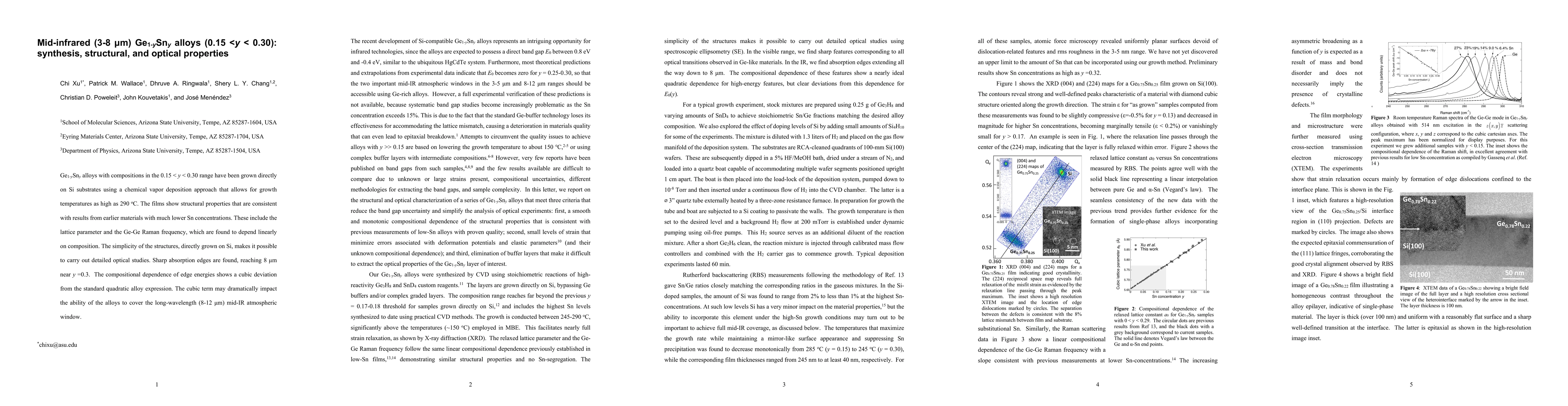 The paper details the synthesis and properties of $\text{Ge}_{1-y}\text{Sn}_y$ alloys with 0.15 < $y$ < 0.30 grown on Si substrates via chemical vapor deposition, revealing a compositional dependence of optical absorption edges that deviates cubically from quadratic predictions.
