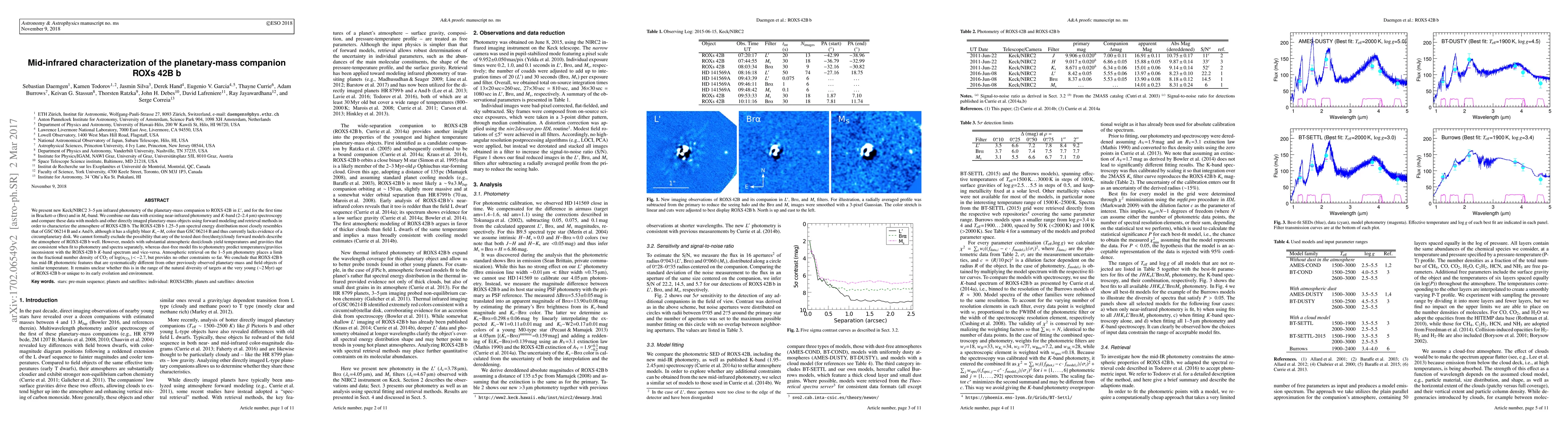 We present new Keck/NIRC2 3$-$5 $\mu$m infrared photometry of the planetary-mass companion to ROXS 42B in $L^\prime$, and for the first time in Brackett-$\alpha$ (Br$\alpha$) and in $M_\mathrm{s}$-band. We combine our data with existing near-infrared photometry and $K$-band (2$-$2.4 $\mu$m) spectroscopy and compare these with models and other directly imaged planetary-mass objects using forward modeling and retrieval methods in order to characterize the atmosphere of ROXS 42B b. ROXS 42B b's 1.25$-$5 $\mu$m spectral energy distribution most closely resembles that of GSC 06214 B and $\kappa$ And b, although it has a slightly bluer $K_{\rm s}$$-$$M_{\rm s}$ color than GSC 06214 B and thus so far lacks evidence for a circumplanetary disk. We cannot formally exclude the possibility that any of the tested dust-free/dusty/cloudy forward models describe atmosphere of ROXS 42B b well. However, models with substantial atmospheric dust/clouds yield temperatures and gravities that are consistent when fit to photometry and spectra separately, whereas dust-free model fits to photometry predict temperatures/gravities inconsistent with ROXS 42B b's $K$-band spectrum and vice-versa. Atmospheric retrieval on the 1$-$5 $\mu$m photometry places a limit on the fractional number density of CO$_2$ of $\log(n_{\rm CO_2})<-2.7$ but provides no other constraints so far. We conclude that ROXS 42B b has mid-IR photometric features that are systematically different from other previously observed planetary-mass and field objects of similar temperature. It remains unclear whether this is in the range of the natural diversity of targets at the very young ($\sim$2 Myr) age of ROXS 42B b, or unique to its early evolution and environment.