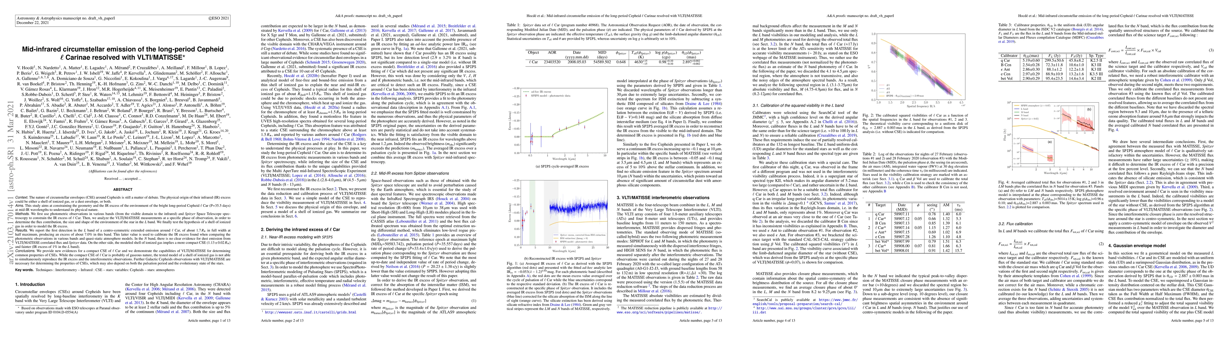 This study investigates the mid-infrared circumstellar emission around the long-period Cepheid $\ell$ Car using VLTI/MATISSE, revealing a centro-symmetric extended emission and a compact circumstellar environment likely of gaseous nature. The findings suggest that while a shell of ionized gas can explain the compact CSE, it does not fully account for the observed infrared excess.