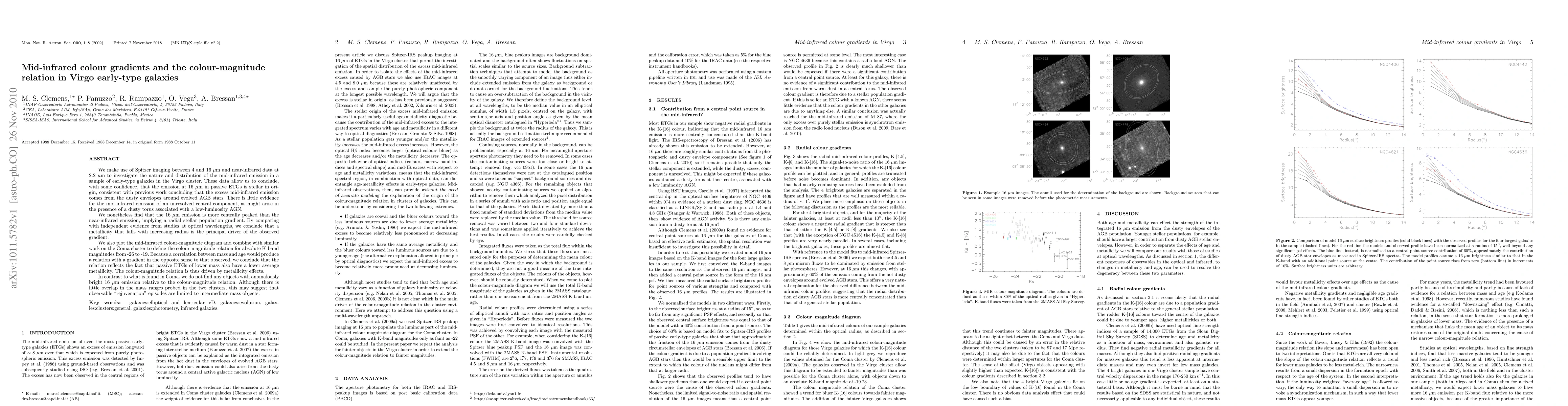 We make use of Spitzer imaging between 4 and 16 micron and near-infrared data at 2.2 micron to investigate the nature and distribution of the mid-infrared emission in a sample of early-type galaxies in the Virgo cluster. These data allow us to conclude, with some confidence, that the emission at 16 micron in passive ETGs is stellar in origin, consistent with previous work concluding that the excess mid-infrared emission comes from the dusty envelopes around evolved AGB stars. There is little evidence for the mid-infrared emission of an unresolved central component, as might arise in the presence of a dusty torus associated with a low-luminosity AGN. We nonetheless find that the 16 micron emission is more centrally peaked than the near-infrared emission, implying a radial stellar population gradient. By comparing with independent evidence from studies at optical wavelengths, we conclude that a metallicity that falls with increasing radius is the principal driver of the observed gradient. We also plot the mid-infrared colour-magnitude diagram and combine with similar work on the Coma cluster to define the colour-magnitude relation for absolute K-band magnitudes from -26 to -19. Because a correlation between mass and age would produce a relation with a gradient in the opposite sense to that observed, we conclude that the relation reflects the fact that passive ETGs of lower mass also have a lower average metallicity. The colour-magnitude relation is thus driven by metallicity effects. In contrast to what is found in Coma, we do not find any objects with anomalously bright 16 micron emission relative to the colour-magnitude relation. Although there is little overlap in the mass ranges probed in the two clusters, this may suggest that observable ``rejuvenation'' episodes are limited to intermediate mass objects.