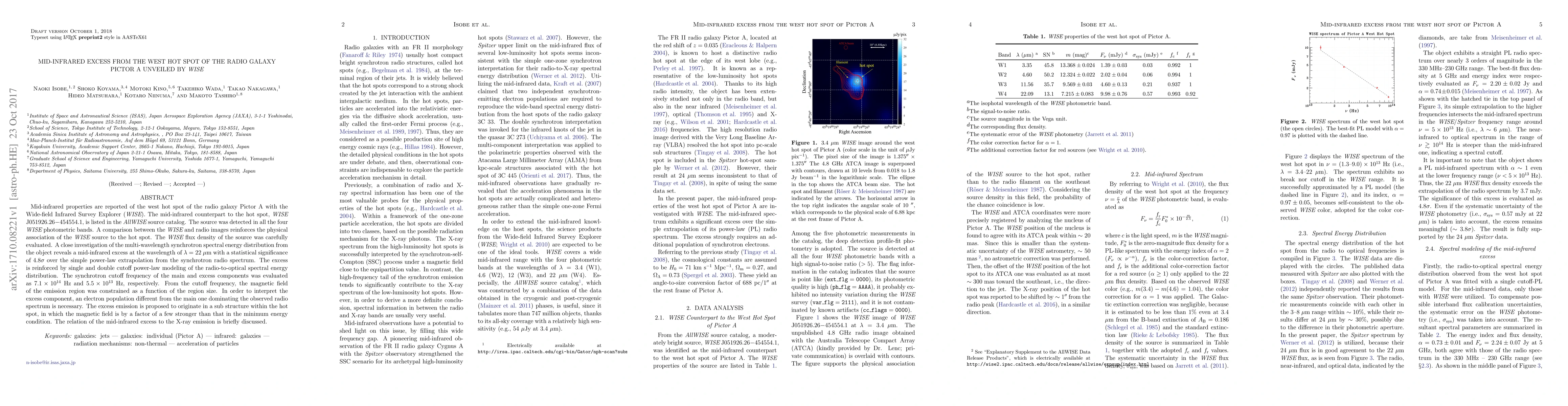 The mid-infrared excess from the west hot spot of radio galaxy Pictor A, detected by WISE, shows a significant excess at 22 μm, suggesting a different electron population and a stronger magnetic field in a sub-structure within the hot spot compared to the main synchrotron emission. The excess is supported by multi-wavelength modeling and spectral analysis.