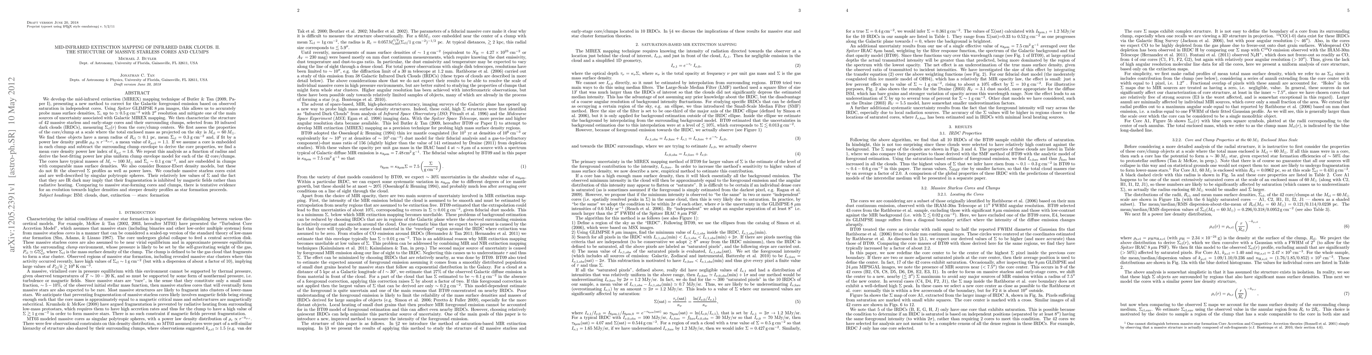 (abridged) We develop the mid-infrared extinction (MIREX) mapping technique of Butler & Tan (2009, Paper I), presenting a new method to correct for the Galactic foreground emission based on observed saturation in independent cores. Using Spitzer GLIMPSE 8 micron images, this allows us to accurately probe mass surface densities, Sigma, up to ~0.5g/cm^2 with 2" resolution. We then characterize the structure of 42 massive starless and early-stage IRDC cores and their surrounding clumps, measuring Sigma_cl(r) from the core/clump centers. We first assess the properties of the core/clump at a scale where the total enclosed mass as projected on the sky is M_cl=60Msun. We find these objects have a mean radius of R_cl~0.1pc, mean Sigma_cl=0.3g/cm^2 and, if fit by a power law density profile rho_cl ~ r^{-k_{rho,cl}}, a mean value of k_{rho,cl}=1.1. If we assume a core is embedded in each clump and subtract the surrounding clump envelope to derive the core properties, we find a mean core density power law index of k_{rho,c} = 1.6. We repeat this analysis as a function of radius and derive the best-fitting power law plus uniform clump envelope model for each of the 42 core/clumps. The cores have typical masses of M_c~100Msun and mean Sigma_c~0.1g/cm^2, and are embedded in clumps with comparable mass surface densities. We conclude massive starless cores exist and are well-described by singular polytropic spheres. Their relatively low values of Sigma and the fact that they are IR dark may imply that their fragmentation is inhibited by magnetic fields rather than radiative heating. Comparing to massive star-forming cores, there is tentative evidence for an evolution towards higher densities and steeper density profiles as star formation proceeds.