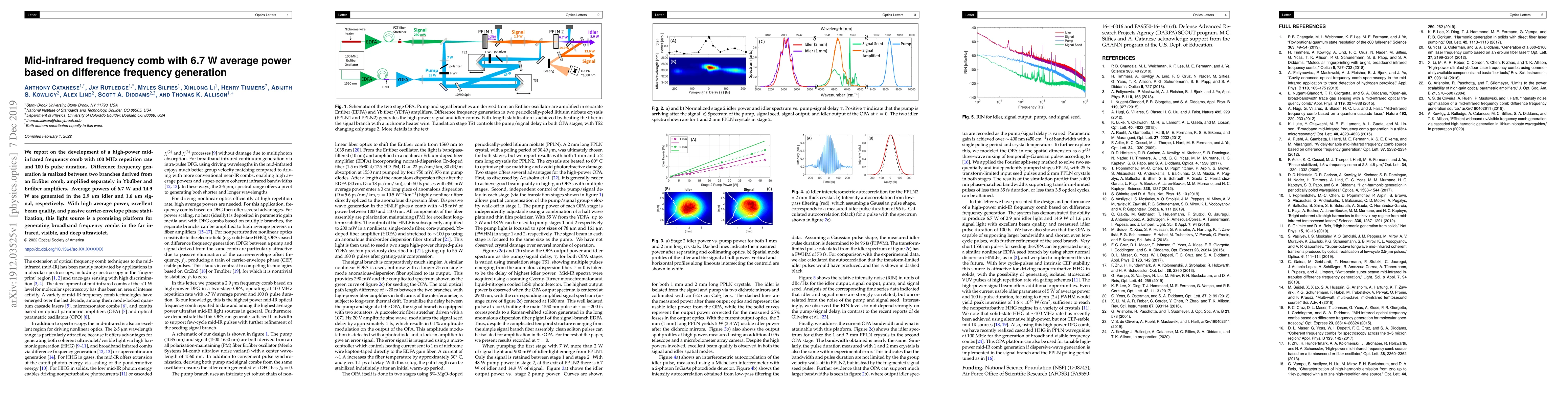 This paper details the creation of a high-power mid-infrared frequency comb with 6.7 W average power, achieved via difference frequency generation between two branches derived from an Er:fiber comb. The system demonstrates potential for generating broadband frequency combs across the far infrared, visible, and deep ultraviolet spectrum.