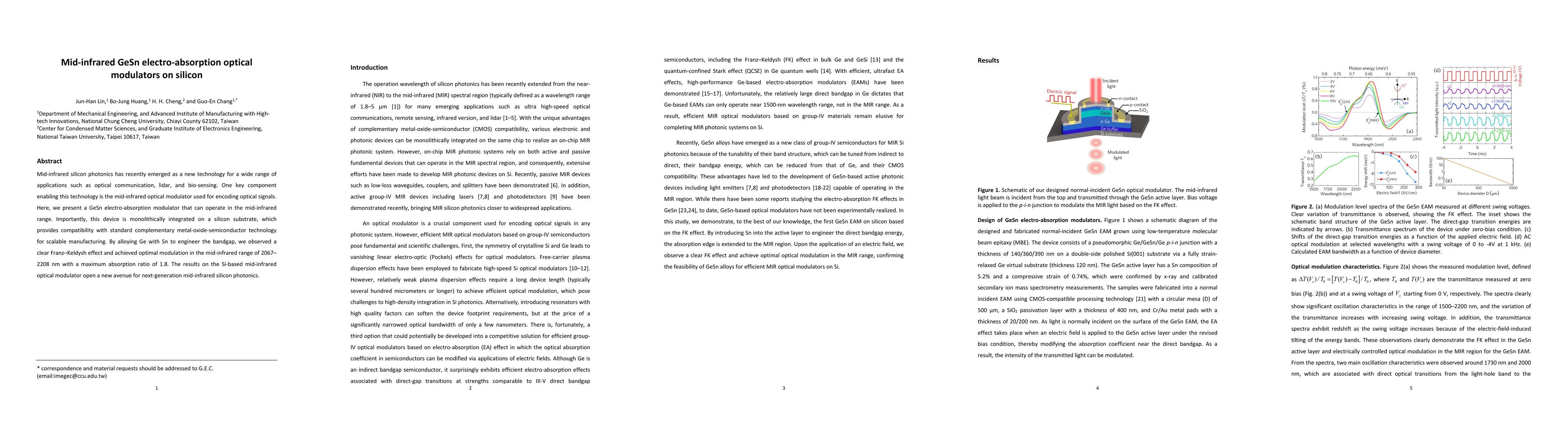 This paper presents a GeSn electro-absorption modulator for mid-infrared optical communication, achieving optimal modulation in the range of 2067-2208 nm. The device is monolithically integrated on silicon, enabling compatibility with existing CMOS technology for scalable manufacturing.