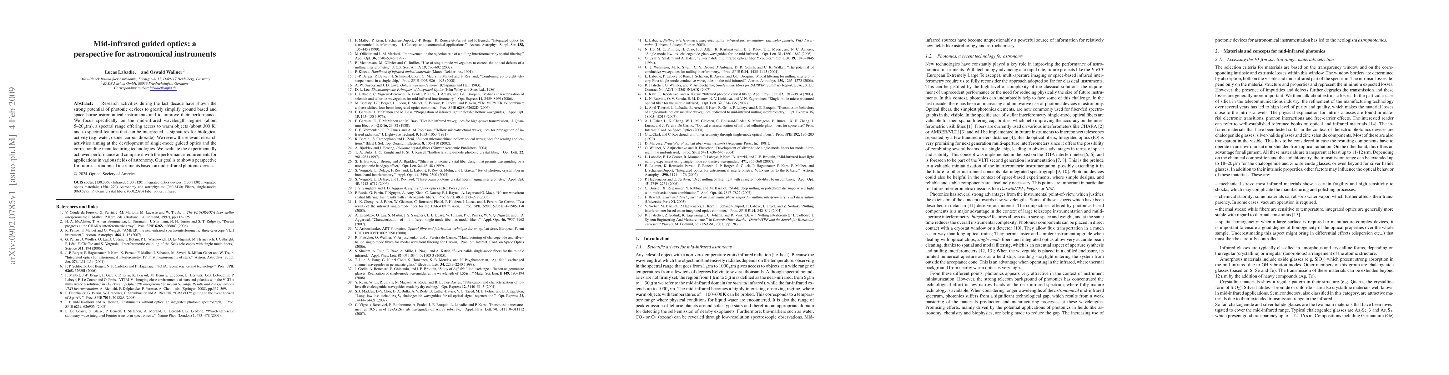 This paper reviews advancements in mid-infrared photonic devices for astronomical instruments, highlighting their potential to enhance performance and simplify both ground-based and space-borne systems. It evaluates the current state of single-mode guided optics technology and compares experimental results against application requirements for future astronomical instruments.
