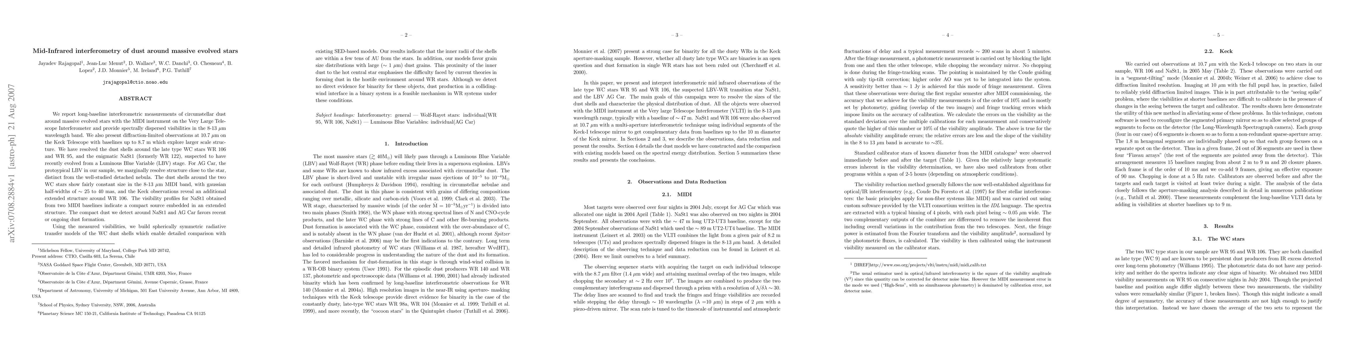This paper reports interferometric observations of dust around massive evolved stars using MIDI and Keck Telescope, revealing resolved dust shells around WC stars and LBVs. The study finds that dust formation near these stars challenges current theories, suggesting large dust grains and proximity to the stars, while hinting at potential binary systems for dust production.