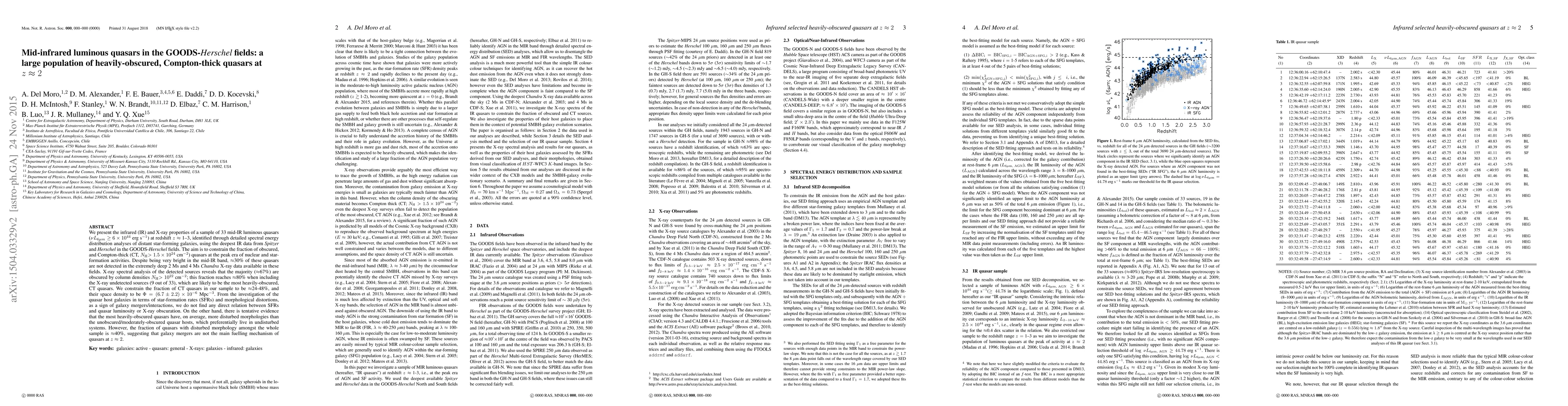 We present the infrared (IR) and X-ray properties of a sample of 33 mid-IR luminous quasars ($\nu$L(6 micron)>6x10$^{44}$ erg/s) at redshift z~1-3, identified through detailed spectral energy distribution analyses of distant star-forming galaxies, using the deepest IR data from Spitzer and Herschel in the GOODS-Herschel fields. The aim is to constrain the fraction of obscured, and Compton-thick (CT, N$_H$>1.5x10$^{24}$ cm$^{-2}$) quasars at the peak era of nuclear and star-formation activities. Despite being very bright in the mid-IR band, ~30% of these quasars are not detected in the extremely deep 2 Ms and 4 Ms Chandra X-ray data available in these fields. X-ray spectral analysis of the detected sources reveals that the majority (~67%) are obscured by column densities N$_H$>10$^{22}$ cm$^{-2}$; this fraction reaches ~80% when including the X-ray undetected sources (9 out of 33), which are likely to be the most heavily-obscured, CT quasars. We constrain the fraction of CT quasars in our sample to be ~24-48%, and their space density to be $\Phi$=(6.7$\pm$2.2)x10$^{-6}$ Mpc$^{-3}$. From the investigation of the quasar host galaxies in terms of star-formation rates (SFRs) and morphological distortions, as a sign of galaxy mergers/interactions, we do not find any direct relation between SFRs and quasar luminosity or X-ray obscuration. On the other hand, there is tentative evidence that the most heavily-obscured quasars have, on average, more disturbed morphologies than the unobscured/moderately-obscured quasar hosts, which preferentially live in undisturbed systems. However, the fraction of quasars with disturbed morphology amongst the whole sample is ~40%, suggesting that galaxy mergers are not the main fuelling mechanism of quasars at z~2.