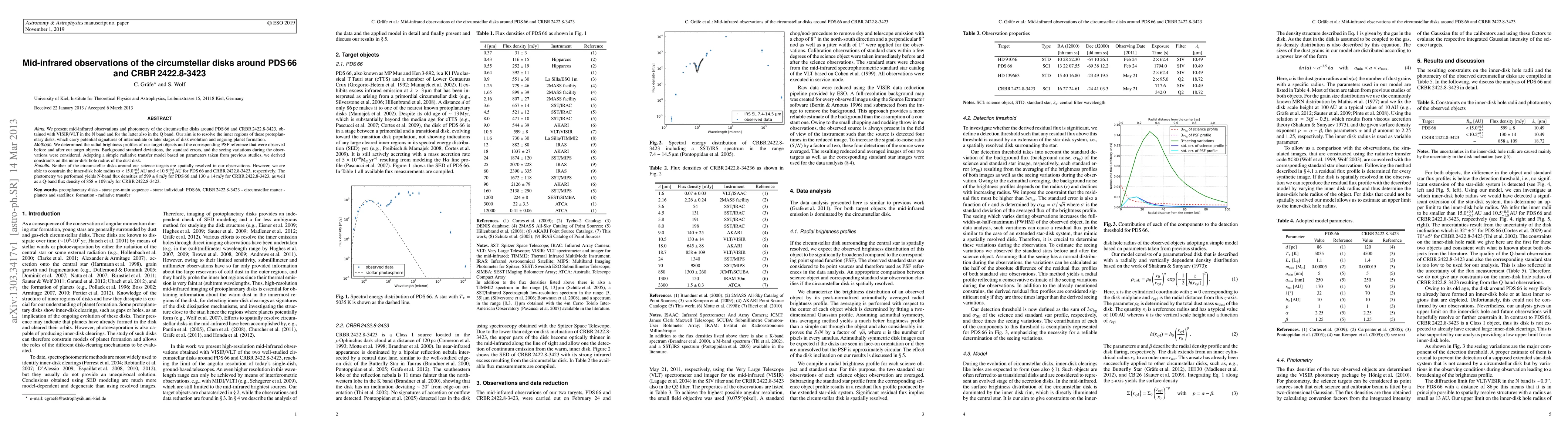 Aims: We present mid-infrared observations and photometry of the circumstellar disks around PDS 66 and CRBR 2422.8-3423, obtained with VISIR/VLT in the N band and for the latter also in the Q band. Our aim is to resolve the inner regions of these protoplanetary disks, which carry potential signatures of intermediate or later stages of disk evolution and ongoing planet formation. Methods: We determined the radial brightness profiles of our target objects and the corresponding PSF reference that were observed before and after our target objects. Background standard deviations, the standard errors, and the seeing variations during the observations were considered. Adopting a simple radiative transfer model based on parameters taken from previous studies, we derived constraints on the inner-disk hole radius of the dust disk. Results: Neither of the circumstellar disks around our science targets are spatially resolved in our observations. However, we are able to constrain the inner-disk hole radius to <15.0(+0.5,-0.5) AU and <10.5(+0.5,-1.0) AU for PDS 66 and CRBR 2422.8-3423, respectively. The photometry we performed yields N-band flux densities of 599+-8 mJy for PDS 66 and 130+-14 mJy for CRBR 2422.8-3423, as well as a Q-band flux density of 858+-109 mJy for CRBR 2422.8-3423.