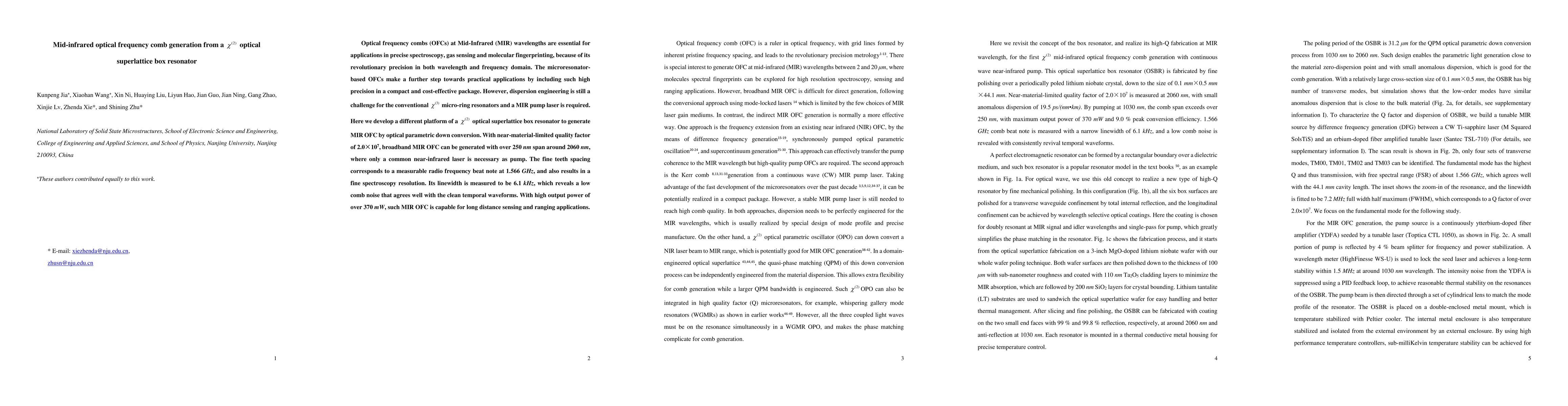The paper presents a novel chi-2 optical superlattice box resonator for generating mid-infrared optical frequency combs (MIR OFCs) via optical parametric down conversion, using a near-infrared laser as a pump source. The system achieves a broadband MIR OFC with high precision, a comb spacing of 1.566 GHz, and a linewidth of 6.1 kHz, demonstrating potential for precise spectroscopy and long-distance sensing applications.